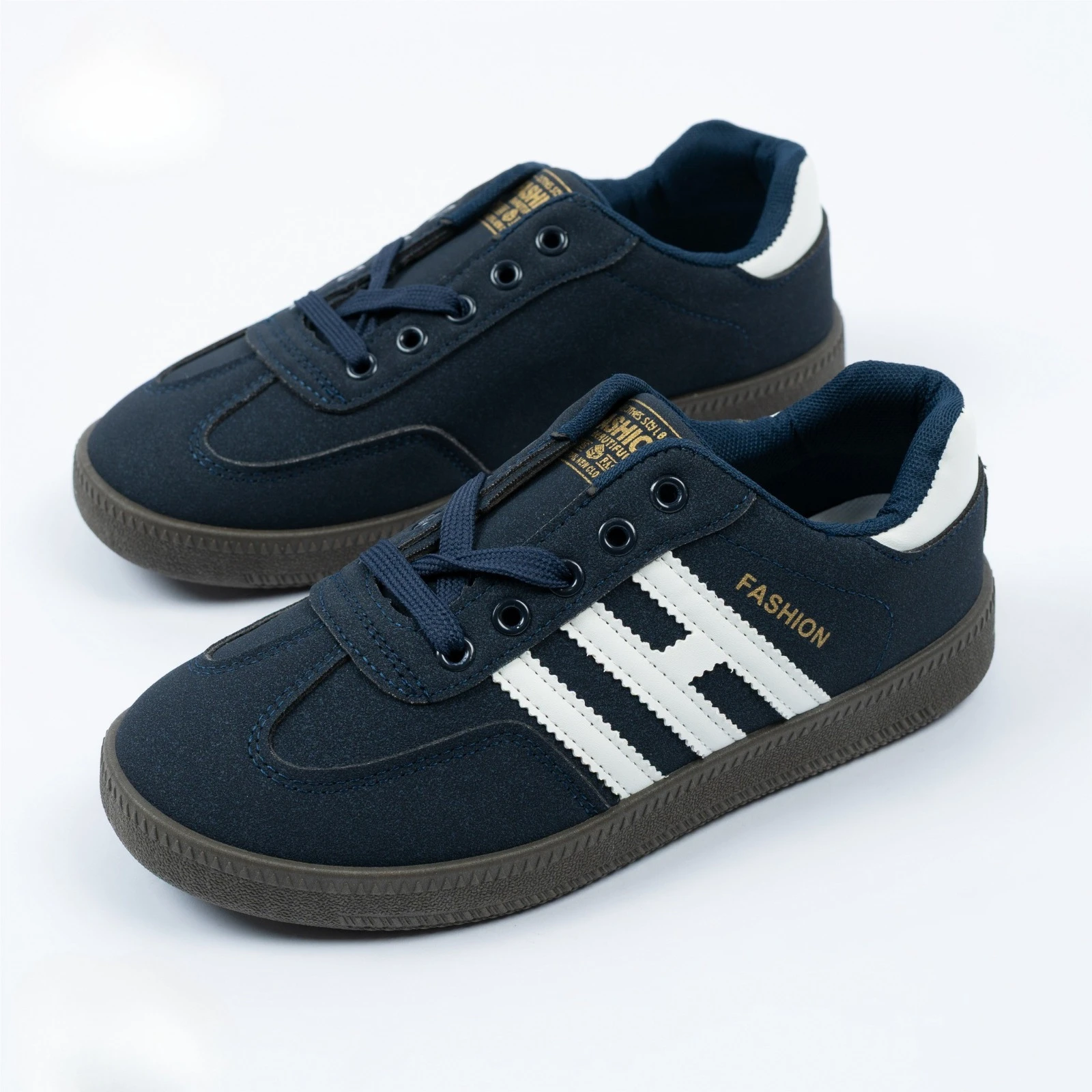 حذاء رياضي أنيق باللون الكحلي، مزين بخطوط بيضاء جانبية تمنحه لمسة عصرية. مصنوع من خامات مريحة وخفيفة الوزن، مع نعل متين يوفر ثباتاً أثناء المشي. مثالي للإطلالات اليومية والمدرسية ويجمع بين الأناقة والراحة في كل خطوة