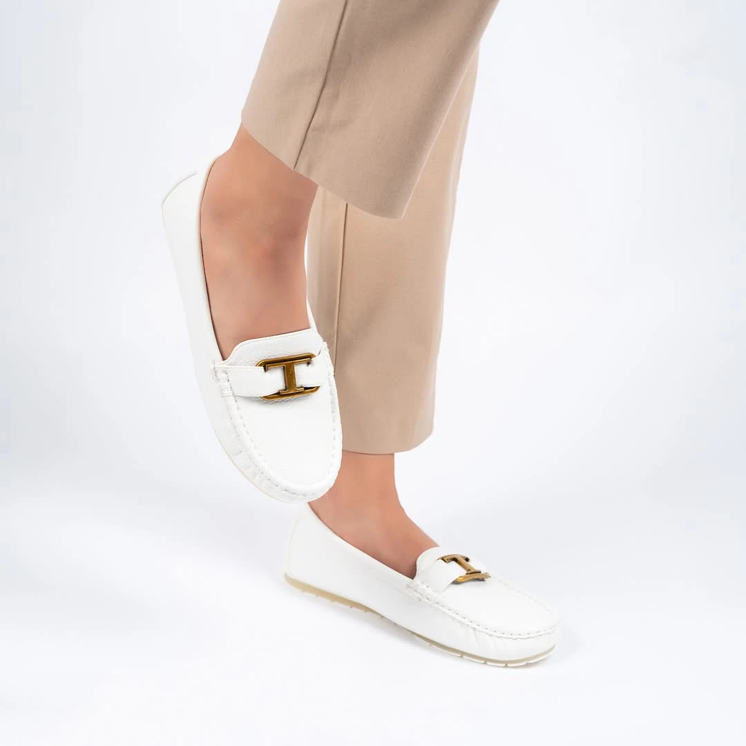حذاء نسائي أنيق باللون الأبيض، مصنوع من خامة جلدية ناعمة ومريحة. يتميز بتصميم كلاسيكي مزين بإبزيم ذهبي فاخر يضفي لمسة من الأناقة الراقية. نعل مرن ومريح يوفر ثباتًا أثناء المشي، مثالي للإطلالات اليومية والرسمية.