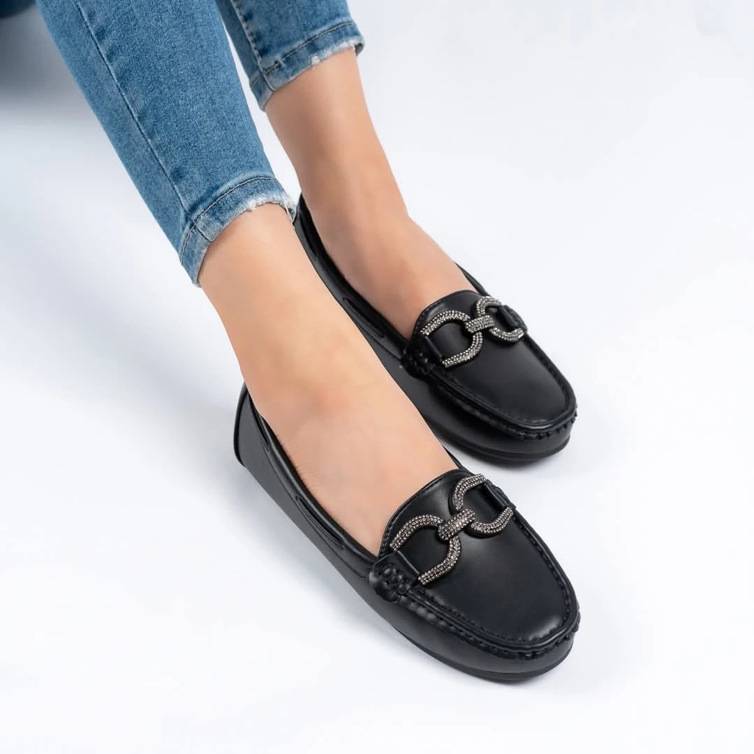 حذاء نسائي أنيق بلون أسود كلاسيكي، يتميز بتصميم فاخر مزين بمشبك معدني لامع يضفي لمسة راقية. مصنوع من خامة ناعمة مريحة مع نعل مرن وخفيف يمنحك ثباتًا أثناء المشي. خيار مثالي للإطلالات اليومية أو الرسمية بأناقة عصرية.