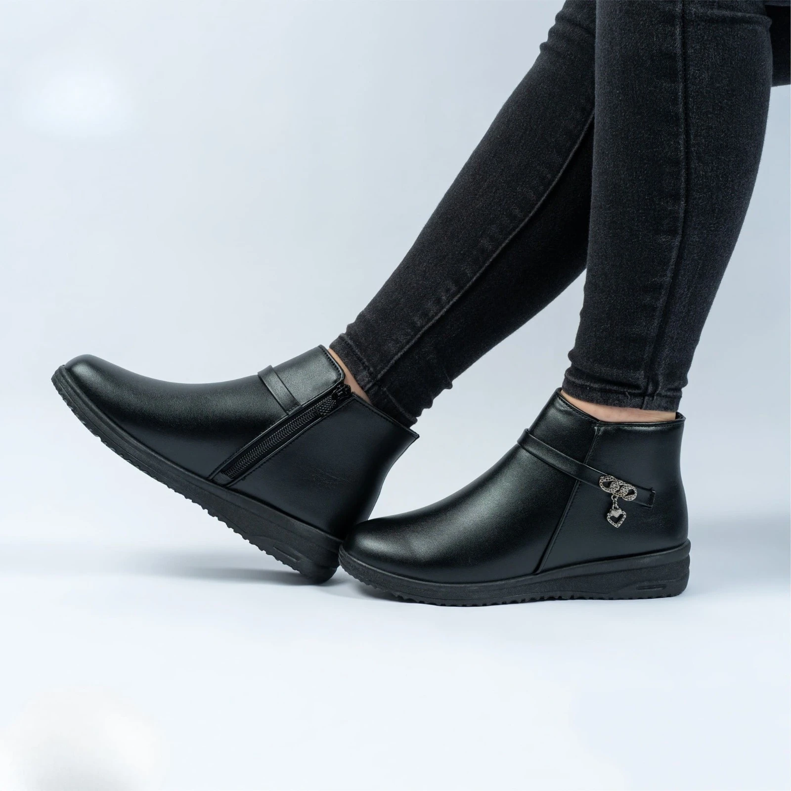 بوت نسائي بتصميم ناعم ومزين بسلسلة جانبية أنثوية، مصنوع من جلد صناعي فاخر مع سحّاب جانبي لسهولة الارتداء ونعل مريح مانع للانزلاق، مثالي للإطلالات الشتوية الأنيقة واليومية.