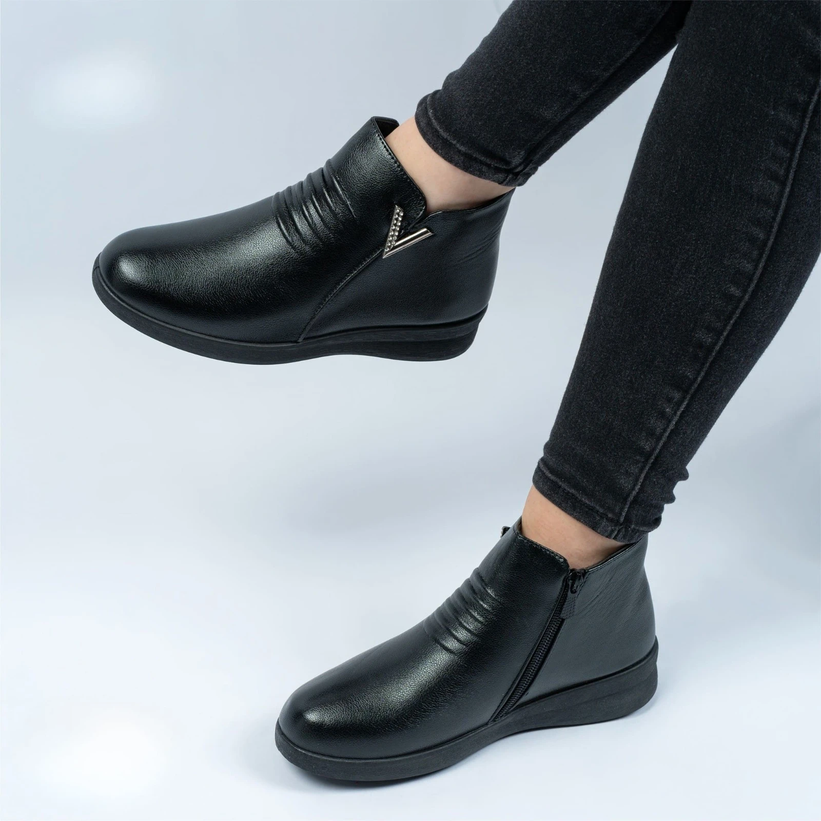 حذاء أنيق بتصميم عصري مزين بتفصيل ذهبي جانبي، مصنوع من جلد صناعي ناعم مع سحّاب جانبي لسهولة الارتداء ونعل مريح مانع للانزلاق، مثالي للإطلالات اليومية والأنيقة.