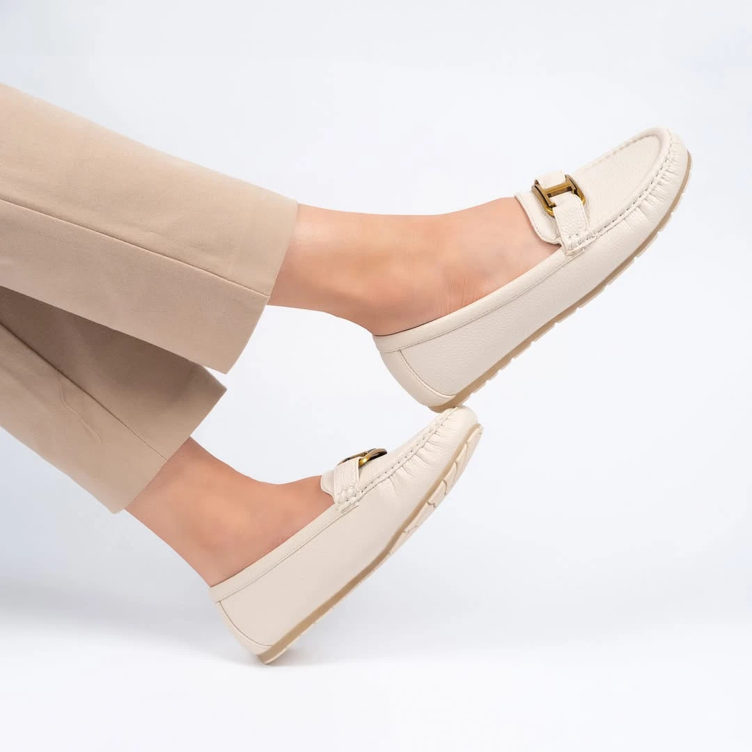 حذاء نسائي أنيق بلون بيج راقٍ يناسب مختلف الإطلالات. مصنوع من خامة جلدية ناعمة توفر الراحة والمرونة طوال اليوم، مزين بإبزيم ذهبي أنيق يضفي لمسة فخامة. تصميم عملي ومريح مثالي للعمل أو الاستخدام اليومي.