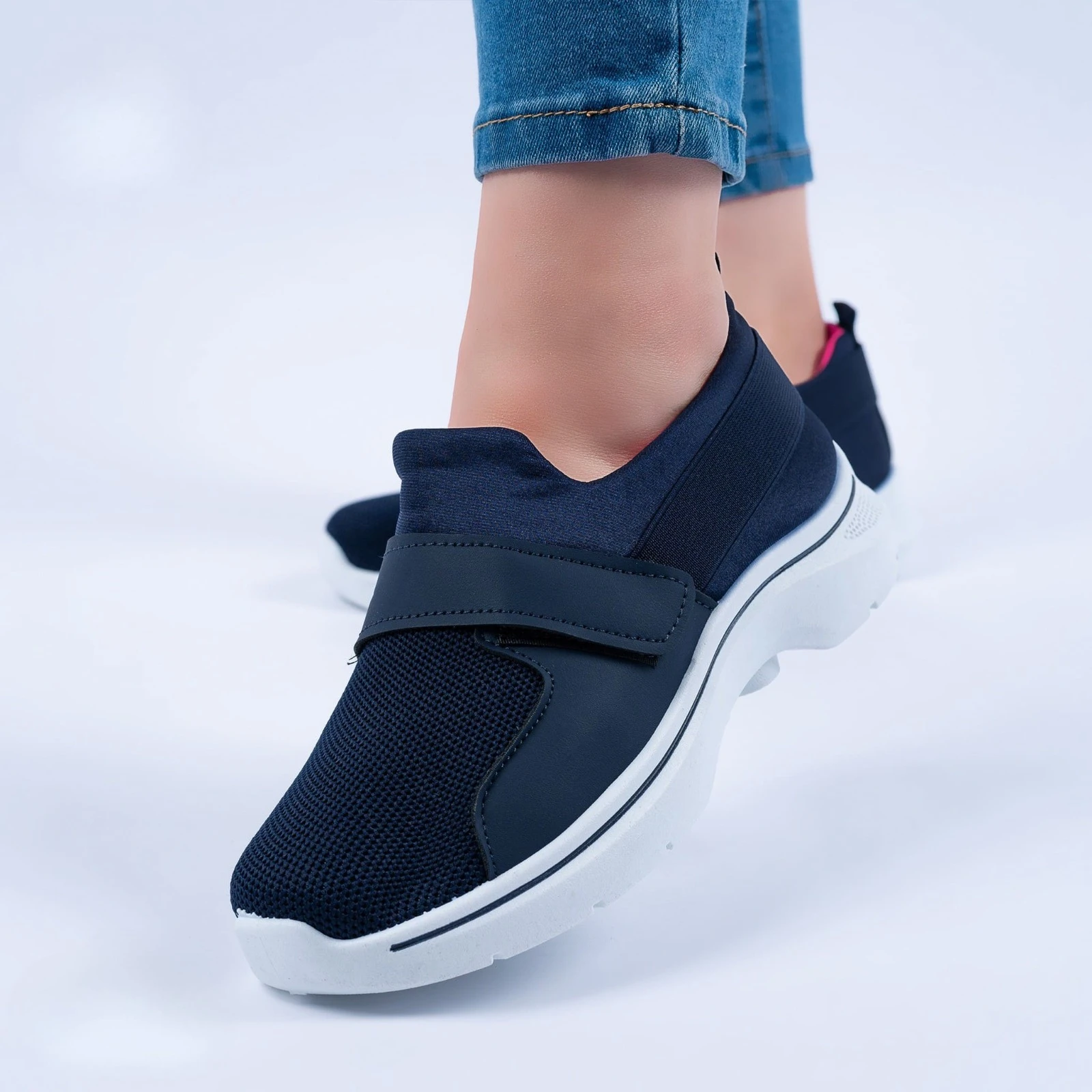 حذاء نسائي مريح باللون الكحلي، يتميز بتصميم عصري بدون أربطة لسهولة الارتداء. مصنوع من خامات ناعمة تسمح بتهوية القدم، مع نعل أبيض خفيف ومتين يمنح راحة أثناء المشي طوال اليوم. مثالي للإطلالات اليومية والنشاطات الكاجوال.