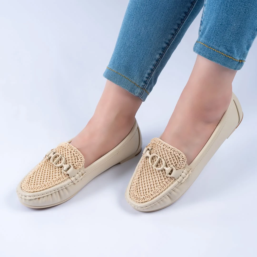 حذاء نسائي أنيق بلون بيج ناعم بتصميم منسوج عصري يجمع بين الأناقة والراحة. يتميز بخامة خفيفة تسمح بتهوية القدم، مع مشبك أمامي أنيق يضيف لمسة فخامة. مثالي للإطلالات اليومية والمشاوير الكاجوال بأناقة مريحة.