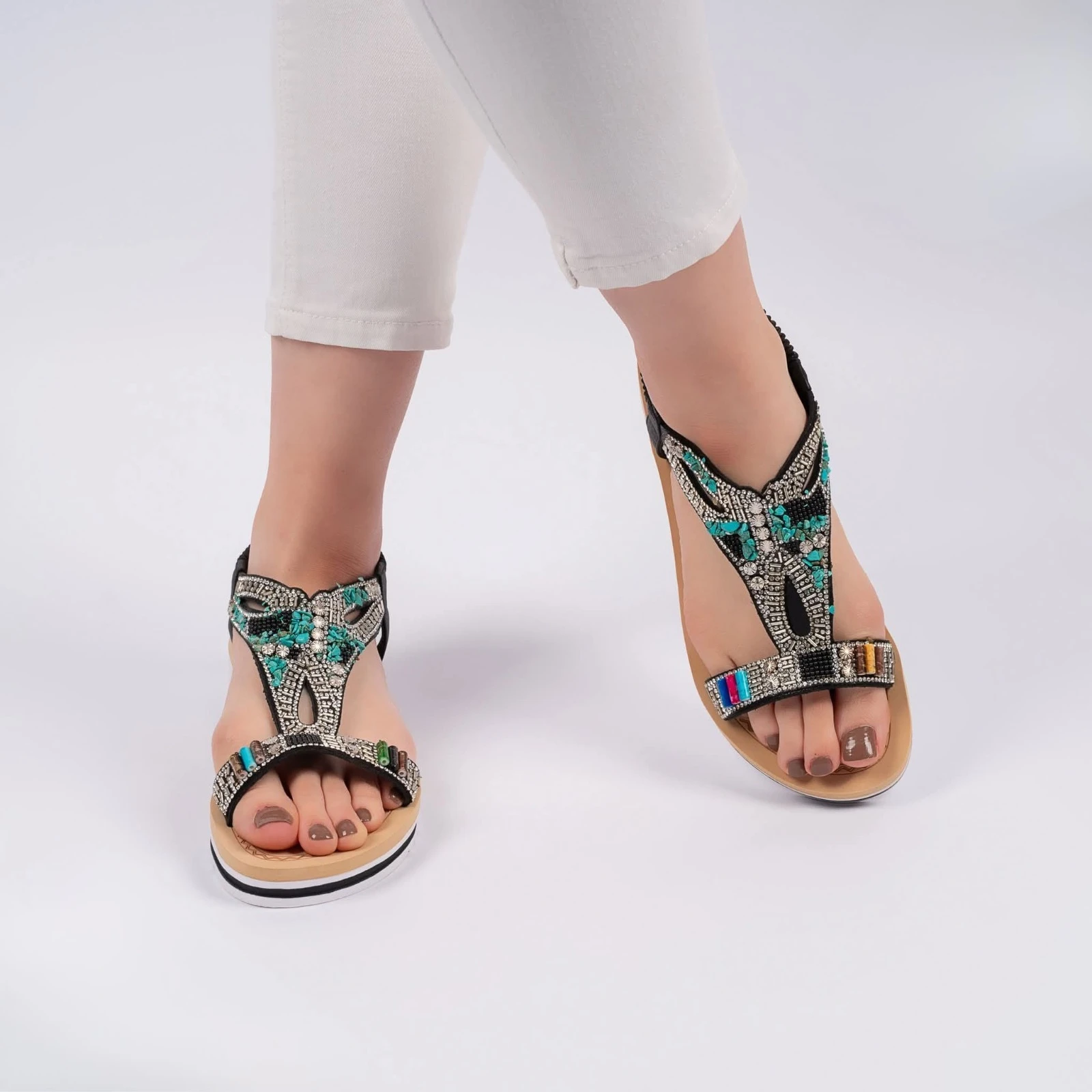 حذاء نسائي أنيق بتصميم مفتوح مزين بالأحجار الملونة اللامعة لإطلالة جذابة. مصنوع من خامات مريحة عالية الجودة مع نعل خفيف يوفر ثباتاً وراحة أثناء المشي. مثالي للمناسبات الصيفية والإطلالات الكاجوال الأنيقة.