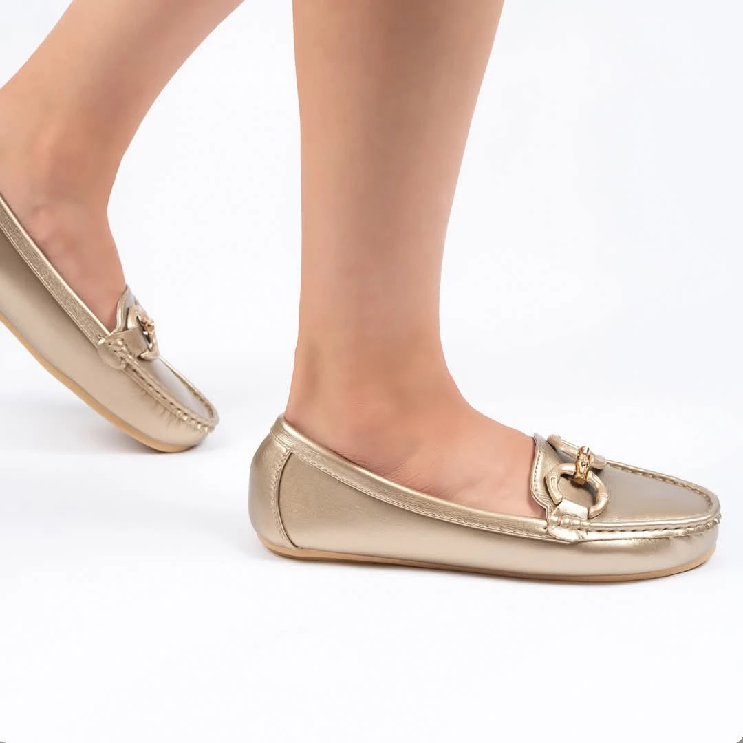 حذاء نسائي أنيق بلون ذهبي لامع يضفي لمسة فخامة على الإطلالة. يتميز بتصميم كلاسيكي مزين بمشبك ذهبي عصري، مصنوع من خامة ناعمة مريحة مع نعل خفيف ومرن يوفر راحة طوال اليوم. مثالي للمناسبات والإطلالات اليومية الراقية.