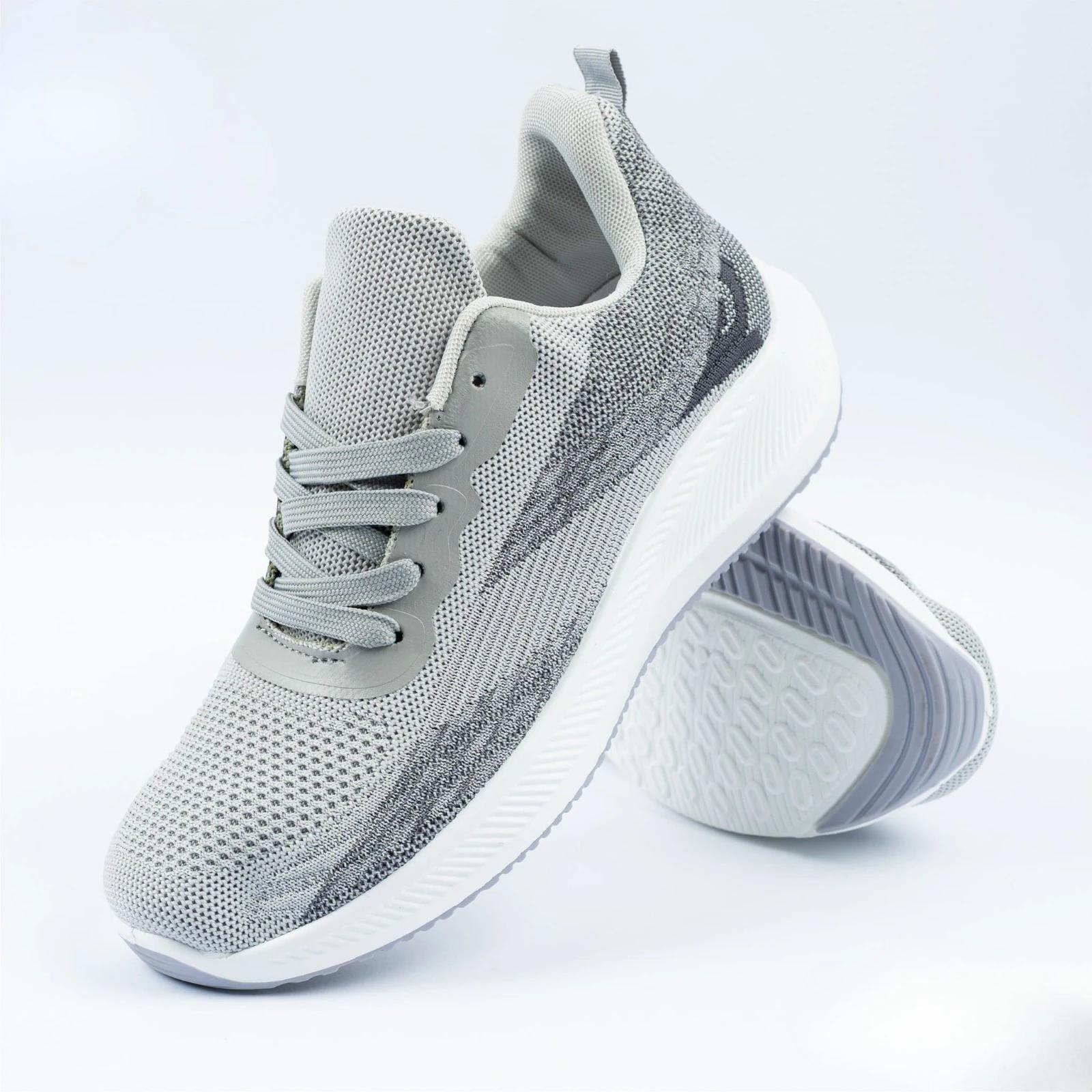 حذاء رياضي أنيق بلون رمادي فاتح بتصميم عصري يجمع بين الراحة والأناقة. مصنوع من خامة شبكية مرنة تسمح بتهوية القدم، مع نعل أبيض خفيف يوفر ثباتاً وامتصاصاً ممتازاً للصدمات. مثالي للتمارين الرياضية والاستخدام اليومي بأسلوب مريح وعصري.