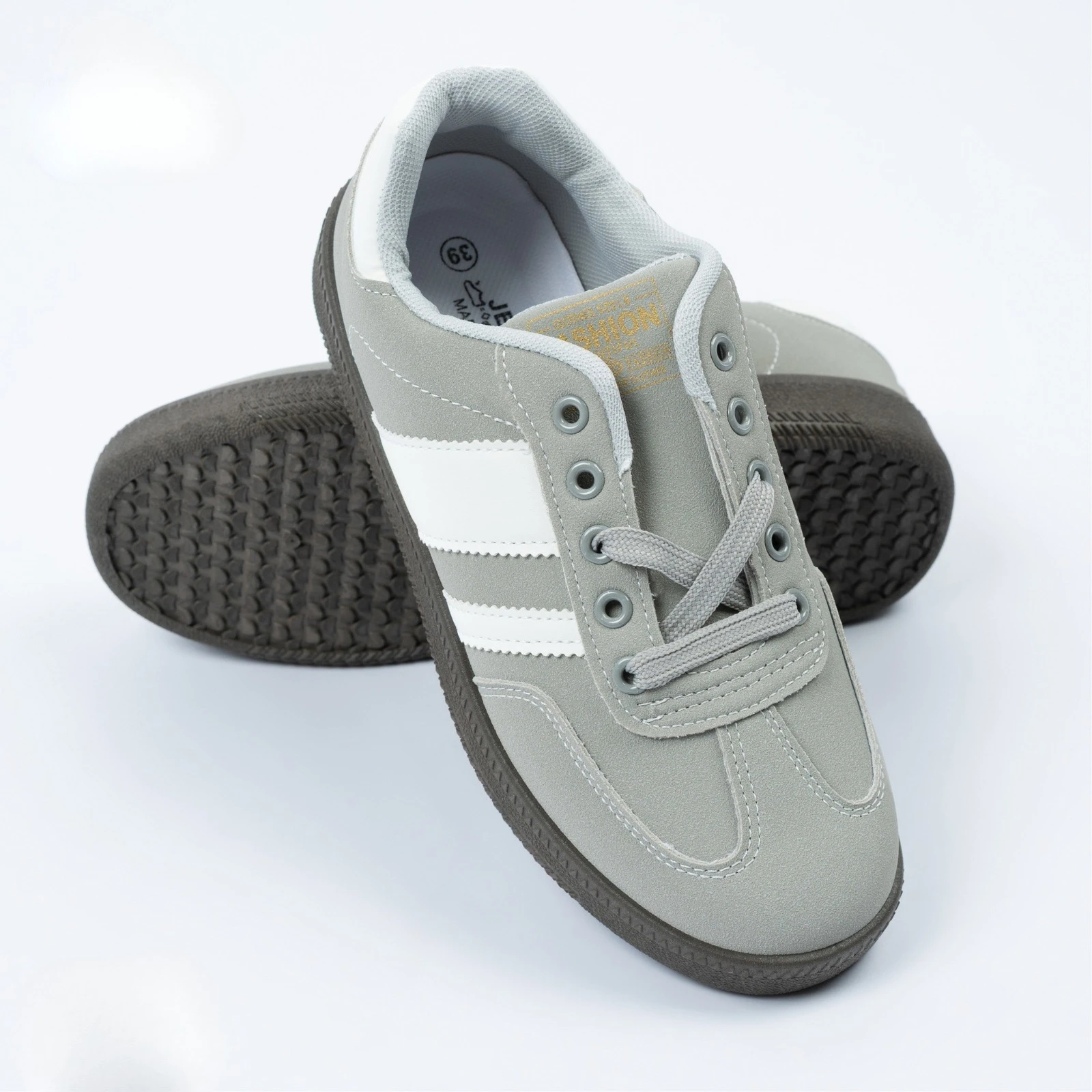 حذاء رياضي بلون رمادي أنيق مزين بخطوط بيضاء جانبية تمنحه مظهراً عصرياً مميزاً. مصنوع من خامات مريحة وخفيفة، مع نعل مطاطي متين يوفر ثباتاً ومرونة أثناء الحركة. مثالي للاستخدام اليومي والمناسبات الكاجوال.