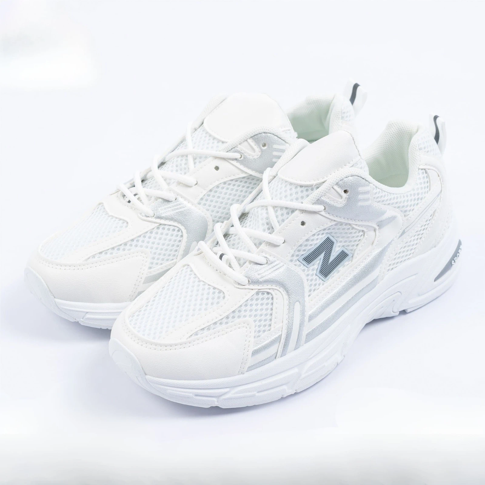 حذاء رياضي أنيق باللون الأبيض بتصميم عصري مريح، مصنوع من خامة شبكية قابلة للتنفس تمنح القدم راحة وانتعاشًا طوال اليوم. يتميز بنعل مرن مضاد للانزلاق يوفر ثباتاً ممتازاً أثناء المشي أو التمارين الرياضية. مثالي للاستخدام اليومي والمظهر العصري البسيط.