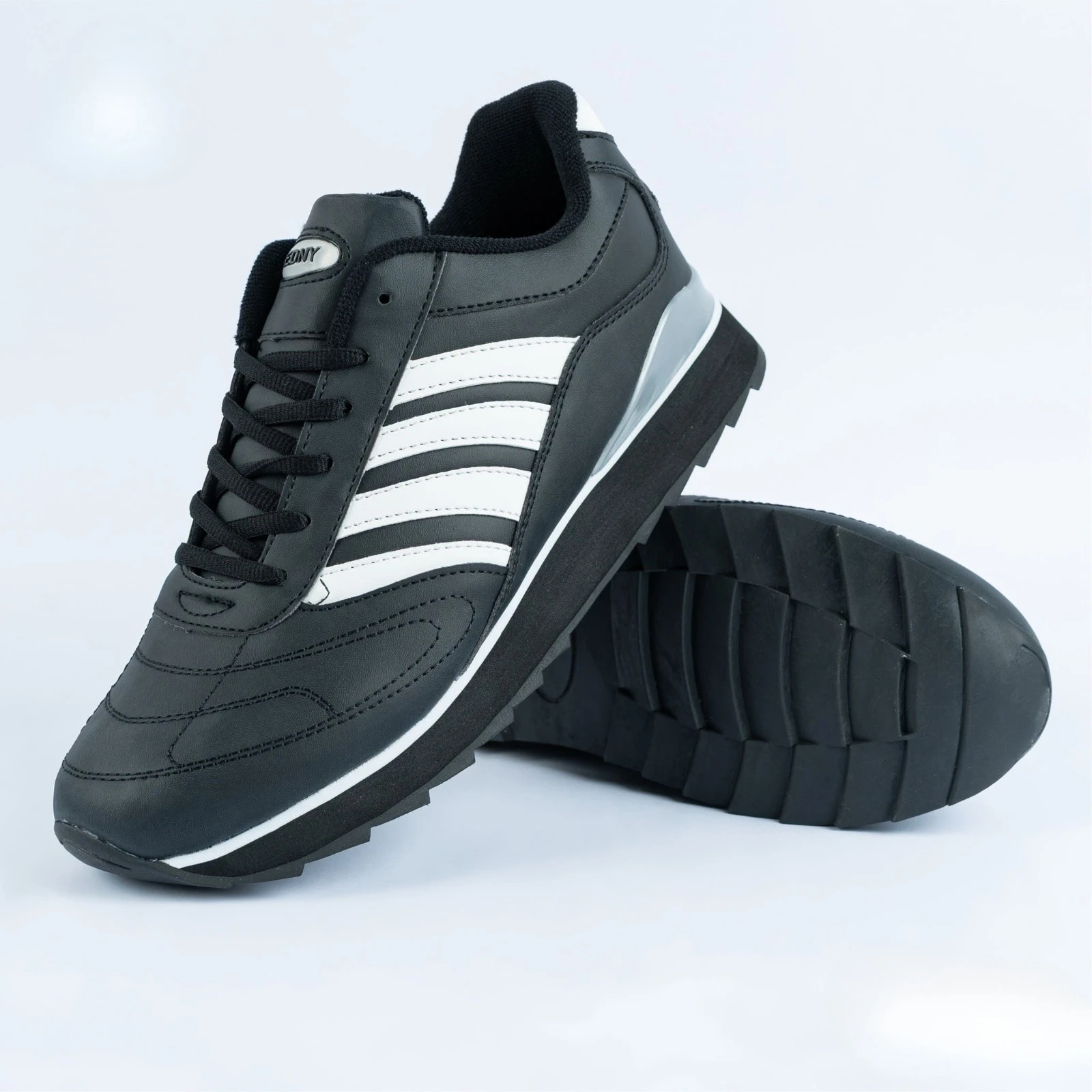 حذاء رياضي أنيق بلون أسود عصري مزين بخطوط بيضاء جانبية، يمنحك مظهراً شبابيًا وراحة مثالية طوال اليوم.