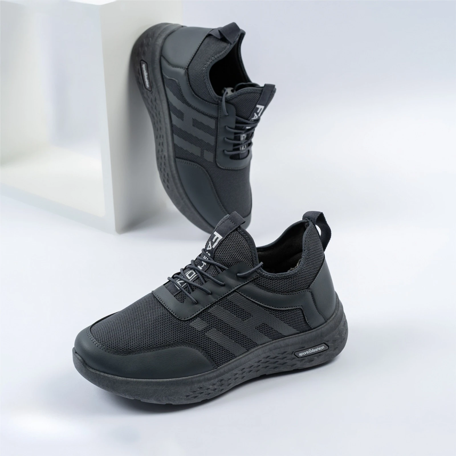 حذاء رياضي أنيق باللون الأسود بتصميم عصري ومريح، مصنوع من خامة شبكية تسمح بمرور الهواء للحفاظ على انتعاش القدم. يتميز بنعل مطاطي خفيف ومرن يوفر ثباتاً أثناء المشي أو التمرين. مثالي للاستخدام اليومي والأنشطة الرياضية.