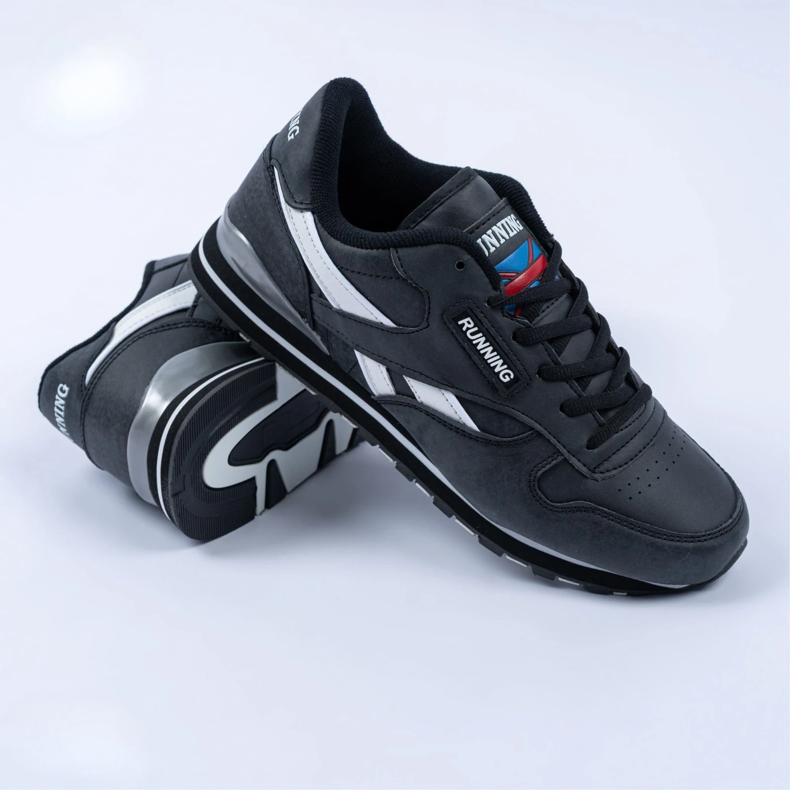 حذاء رياضي أنيق باللون الأسود مع خطوط بيضاء جانبية تمنحه مظهراً عصرياً وجذاباً. مصنوع من خامات متينة وخفيفة الوزن، ويتميز بنعل مريح يوفر امتصاصاً ممتازاً للصدمات أثناء الحركة. مثالي للجري، التمارين الرياضية، أو للاستخدام اليومي بإطلالة شبابية رياضية.