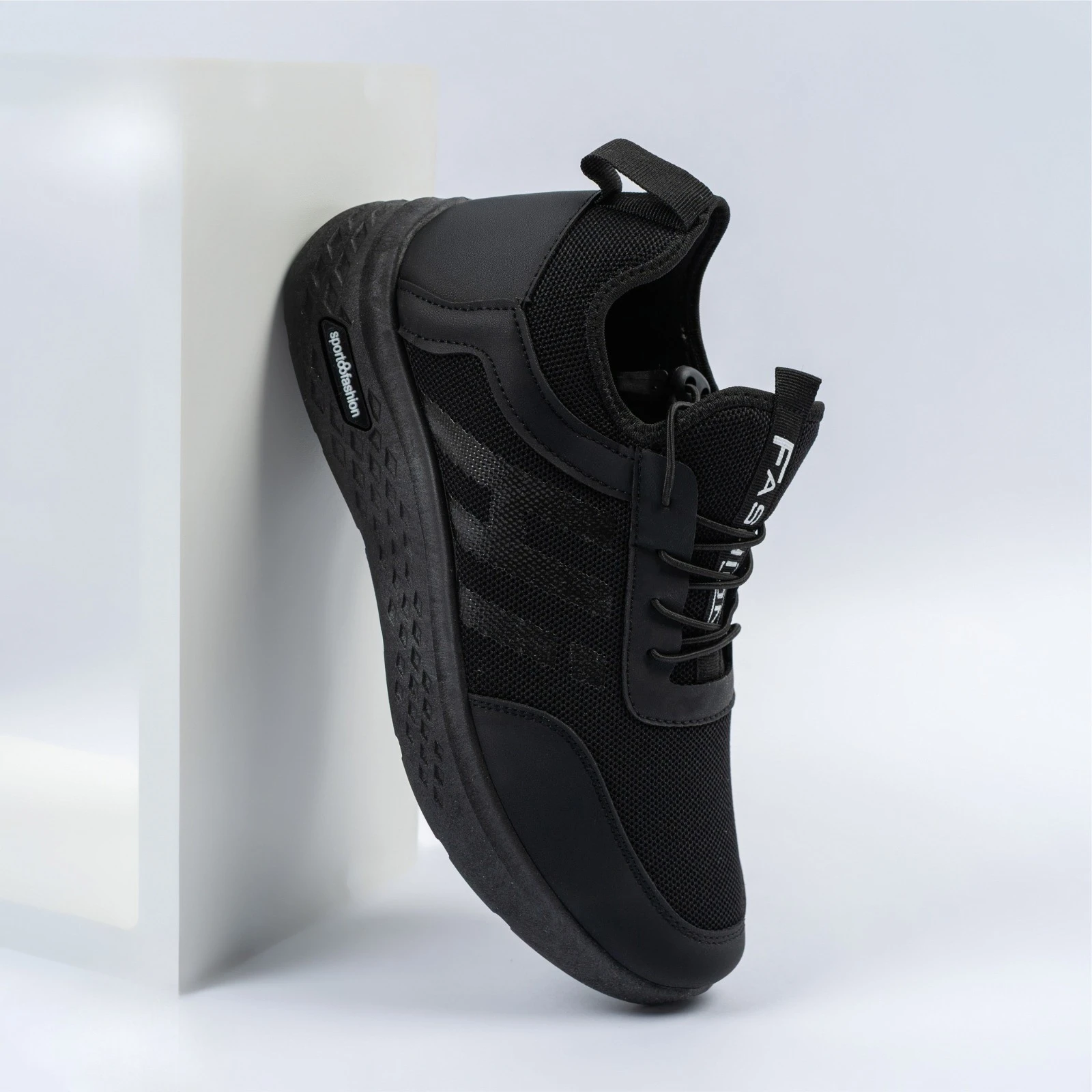 حذاء رياضي باللون الأسود بتصميم عصري وأنيق، مصنوع من خامة شبكية خفيفة تسمح بمرور الهواء لراحة القدم. يتميز بنعل مطاطي مرن يوفر ثباتاً ممتازاً أثناء المشي أو التمرين. مثالي للاستخدام اليومي والأنشطة الرياضية.