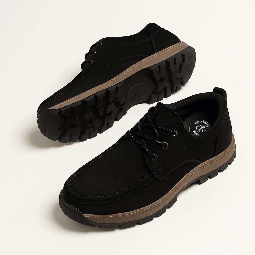 حذاء طبي رجالي باللون الأسود بتصميم عملي وأنيق مزود بأربطة أمامية لثبات مريح. يتميز بنعل طبي مرن مضاد للانزلاق يوفر دعماً ممتازاً لقوس القدم وامتصاصاً للصدمات، مما يجعله مثالياً للمشي اليومي والعمل لفترات طويلة براحة تامة.