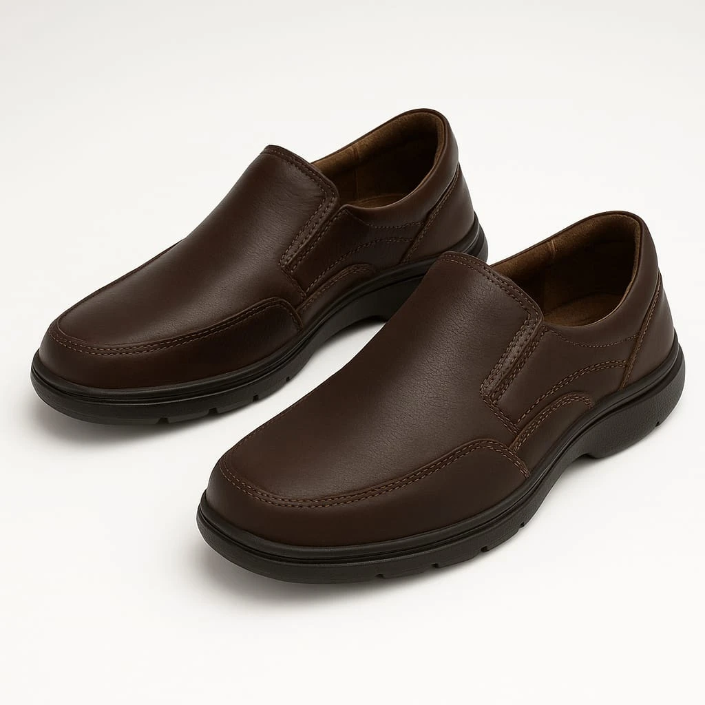 حذاء طبي رجالي مريح مصنوع من الجلد البني عالي الجودة، بتصميم عملي بدون أربطة لسهولة الارتداء. يتميز بنعل طبي مرن مضاد للانزلاق يوفر دعمًا مثاليًا للقدم وراحة تدوم طوال اليوم، مناسب للاستخدام اليومي والعمل