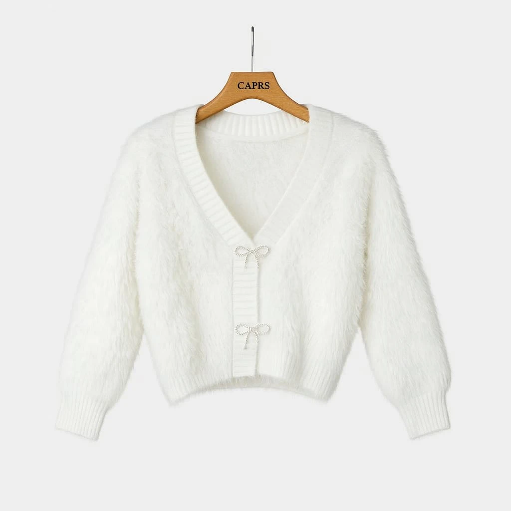 كارديغان نسائي أنيق بلون أبيض ناعم، مصنوع من خامة فروية دافئة تمنحك إحساساً بالراحة والفخامة. يتميز بفتحة أمامية على شكل حرف V مع ربطات صغيرة تضيف لمسة أنثوية راقية، مناسب للإطلالات الشتوية الكاجوال أو الأنيقة.