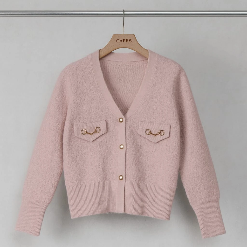 كارديغان نسائي أنيق بلون وردي هادئ مزين بأزرار ذهبية وجيوب أمامية بتفاصيل معدنية راقية. مصنوع من خامة ناعمة ودافئة تمنح راحة وأناقة في الإطلالات اليومية والشتوية العصرية.