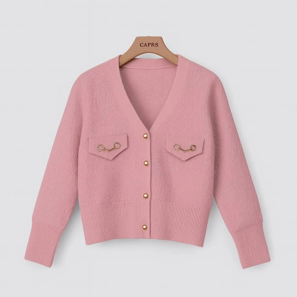 كارديغان نسائي أنيق بلون وردي ناعم، مزين بأزرار ذهبية وجيوب أمامية بتفاصيل معدنية فخمة تضيف لمسة راقية. مصنوع من خامة دافئة وناعمة بفتحة رقبة على شكل حرف V، مثالي لإطلالة أنثوية أنيقة في الأجواء الباردة.