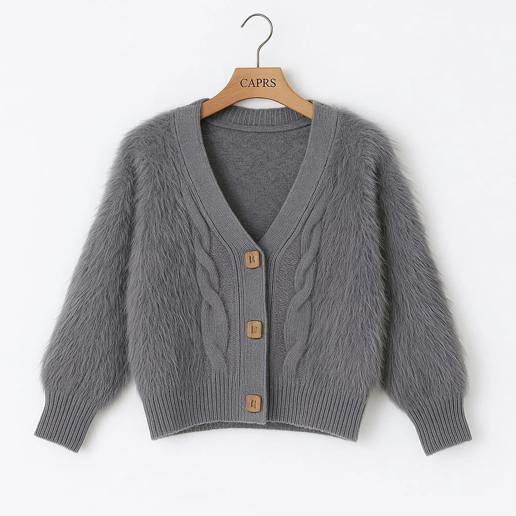 كارديغان نسائي أنيق بلون رمادي ناعم، يتميز بخامة فروية دافئة ولمسة فخمة، مع أزرار أمامية بلون خشبي تضيف لمسة عصرية مميزة. تصميمه المريح والأنيق يجعله خيارًا مثاليًا للإطلالات اليومية والشتوية الأنيقة.