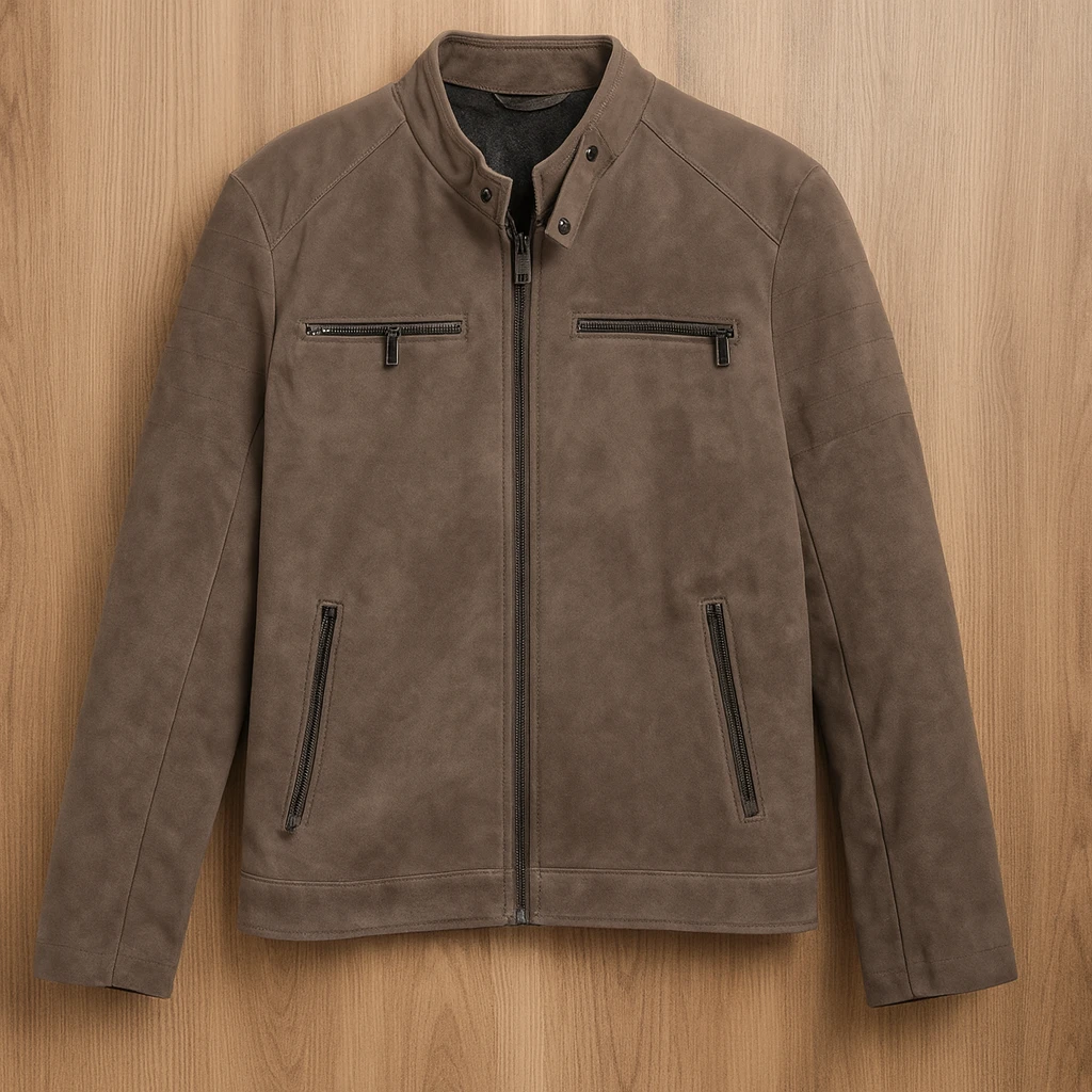 خامة سويدية بلون بني دافئ، بتصميم عصري وبسيط. يتميّز بسحّاب أمامي كامل، وجيبين علويين وجيبين جانبيين مزوّدين بسحّابات لإطلالة عملية وأنيقة. الياقة مستقيمة مع أزرار كبس، مما يمنح الجاكيت لمسة فخمة تناسب الإطلالات اليومية أو الكاجوال الأنيقة. خامته تبدو ناعمة ومريحة، ومثالية لفصل الخريف أو الشتاء.