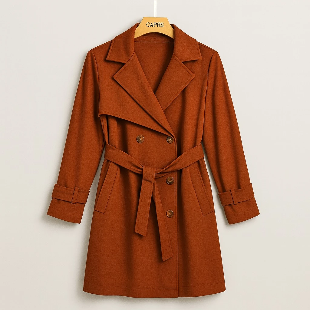 معطف نسائي أنيق بلون طوبي دافئ، تصميم عصري كلاسيكي بفتحة ياقة واسعة تضفي لمسة فخمة. مزود بأزرار أمامية مزدوجة وحزام بنفس اللون لشد الخصر والتحكم بالمقاس وإبراز القوام. أكمام طويلة مع تفاصيل ربط أنيقة على المعصم لإطلالة راقية.