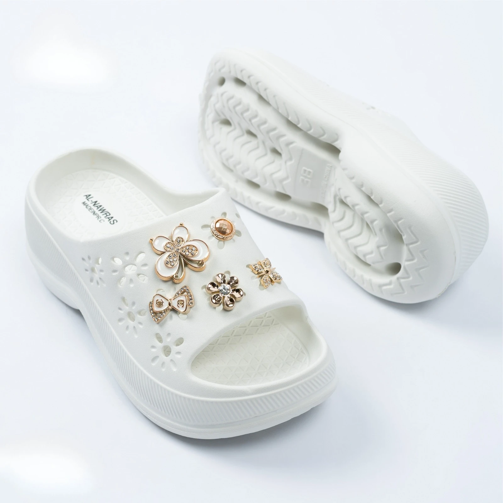 صندل نسائي أنيق باللون الأبيض بتصميم مريح وعصري، مزين بقطع ذهبية لامعة تضيف لمسة من الفخامة والأنوثة. يتميز بنعل مرتفع مريح وخفيف، مثالي للإطلالات الصيفية اليومية والأوقات المريحة.