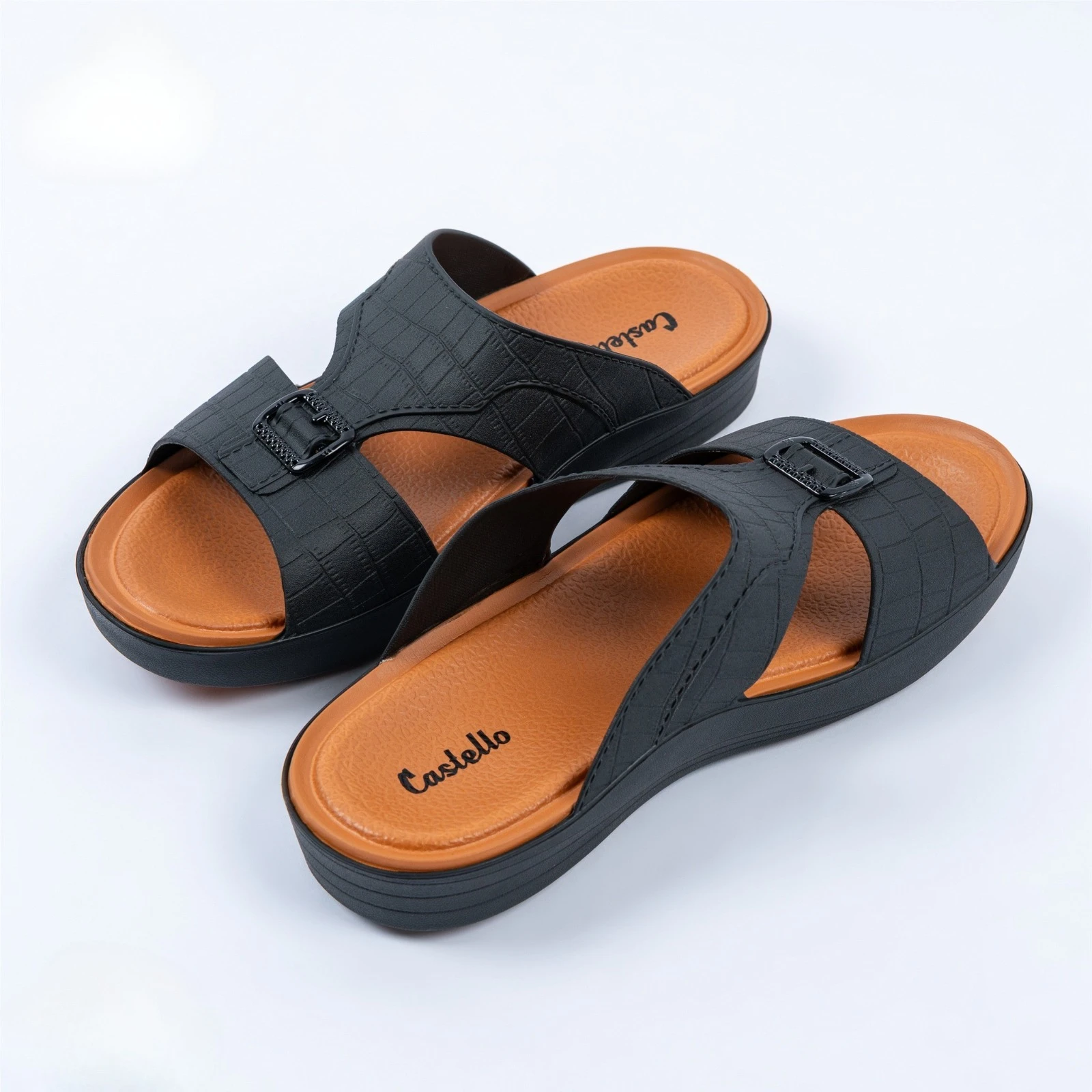 صندل رجالي بتصميم أنيق وعصري، يجمع بين الراحة والمتانة. يتميز بلون أسود جذاب مع نعل داخلي بلون بني مريح، وخامة مرنة تمنحك ثباتاً وراحة في كل خطوة. مثالي للاستخدام اليومي والمناسبات الكاجوال.