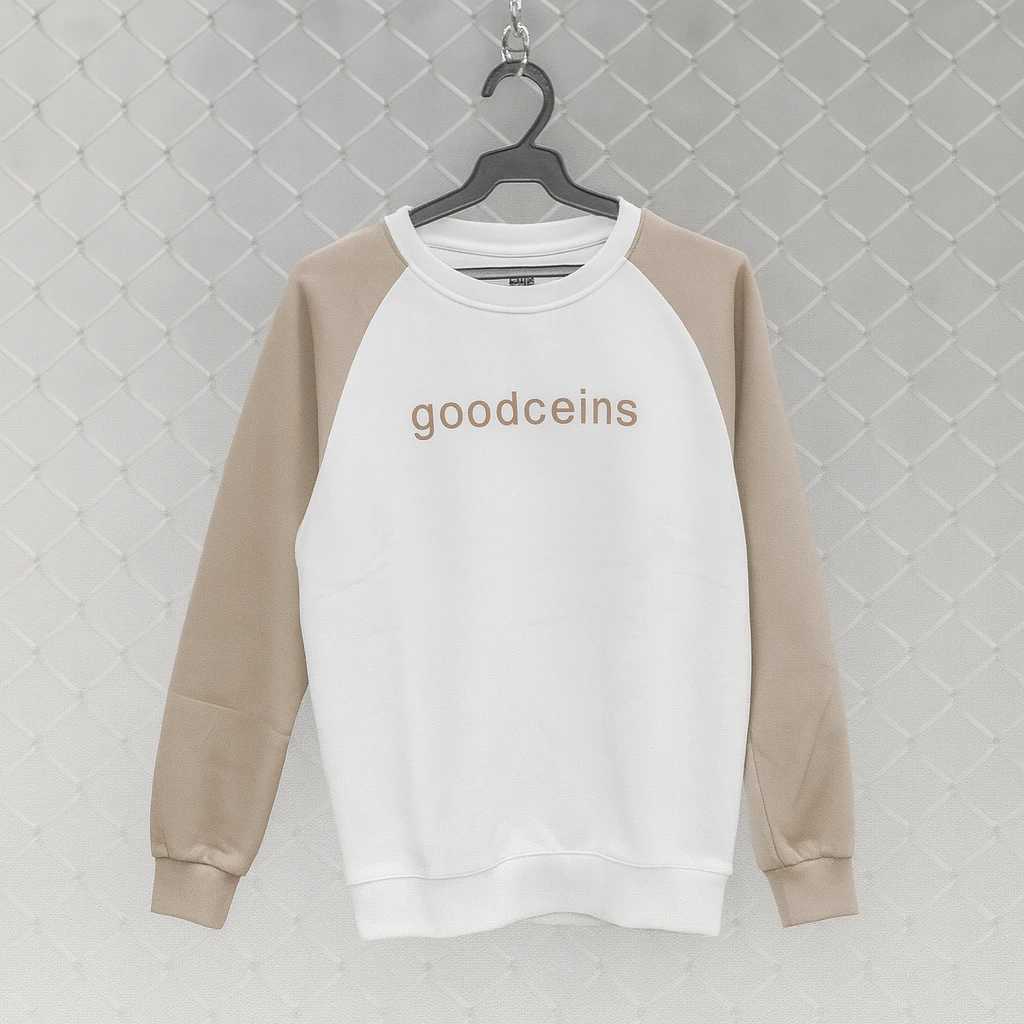 سويت شيرت رجالي أنيق بتصميم عصري بلونين، أبيض مع أكمام باللون البيج. مصنوع من قماش قطني ناعم عالي الجودة يمنحك دفئًا وراحة طوال اليوم. يتميّز بطباعة أمامية بكلمة "goodceins" تضيف لمسة شبابية مميزة، مثالي للإطلالات الكاجوال واليومية العصرية.