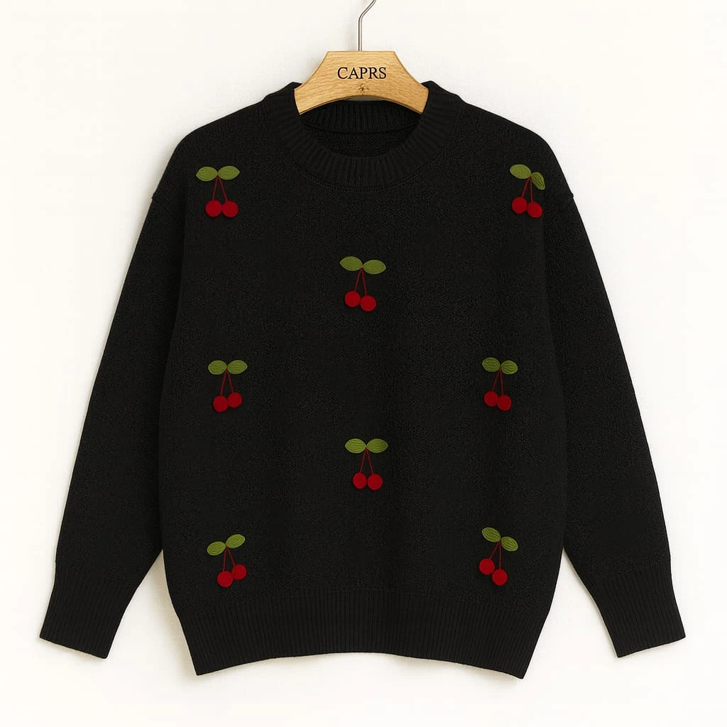 سويتر بنسيج مريح وقصّة كلاسيكية، يزدان بكرز مطرّز يمنح لمسة مرحة على أساس أسود أنيق. خيار مثالي لإطلالة يومية راقية، يتناسق بسهولة مع كل الألوان والأحذية الرياضية أو الجلدية.