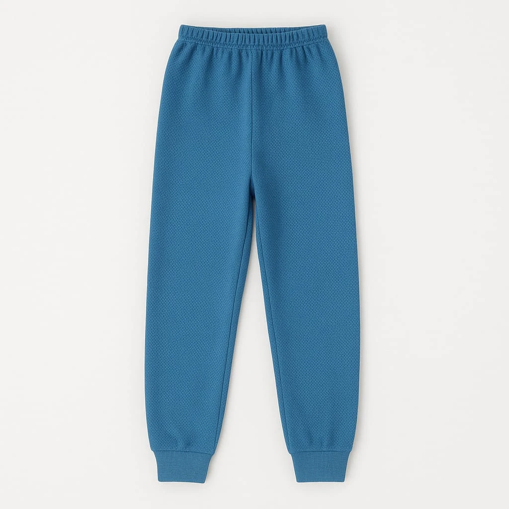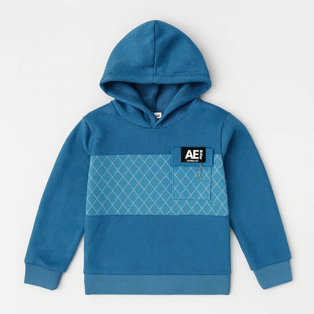 سويتشيرت ولادي ناعم باللون الأزرق السماوي مع نقش هندسي خفيف وتفاصيل شعار أمامي.