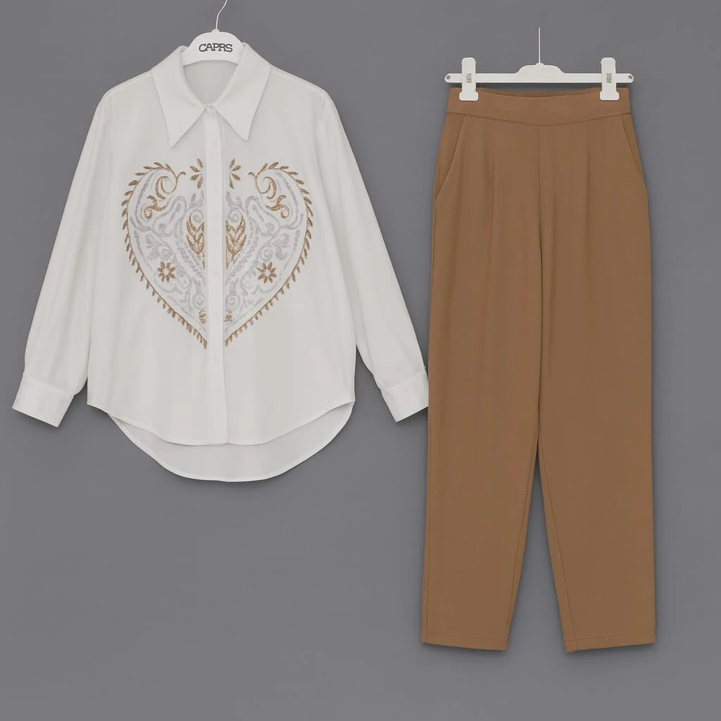 طقم أنثوي ناعم بتصميم فخم يجمع بين قميص أبيض مطرز بنقوش ذهبية على شكل قلب وبنطال كراميل أنيق. خامة مريحة وتفاصيل دقيقة تمنحك إطلالة أنيقة وراقية في جميع المناسبات