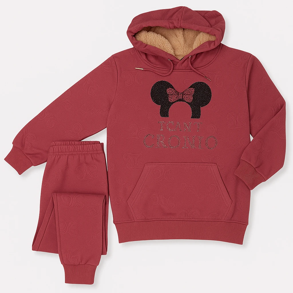 طقم شتوي ناعم باللون الأحمر الداكن، يتميز ببلوزة بقبعة مبطنة بالفرو الدافئ، مطرزة بتصميم أنثوي لامع لشخصية مرحة تضيف لمسة من الحيوية.