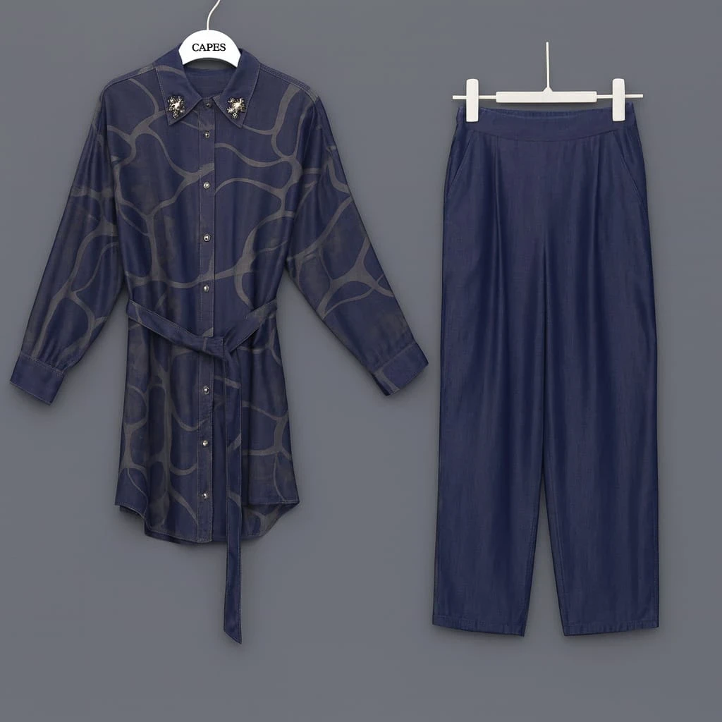 طقم أنيق مصنوع من قماش الدنيم الكحلي الفاخر، يتكوّن من قميص طويل الأكمام مزوّد بحزام خصر يبرز القوام ويمنح مظهراً أنثوياً عصرياً، مع بنطال مستقيم القَصّة يوفر راحة وأناقة في الوقت نفسه. يتميز القميص بتفاصيل فريدة على الياقة ونقوش ناعمة تضيف لمسة راقية. خيار مثالي للإطلالات اليومية أو العملية بأسلوب متجدد من CAPRS.