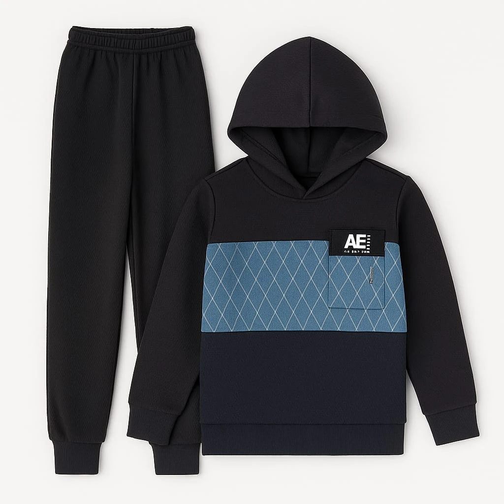 طقم شتوي أنيق بلون أسود مع شريط أزرق بنقشة ماسية أنيقة وشعار أمامي صغير.