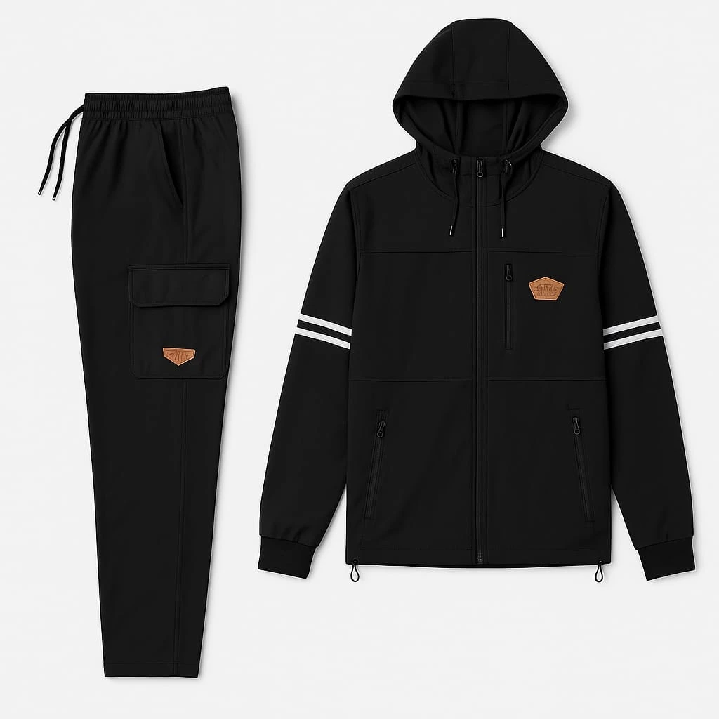 طقم رجالي أنيق بلون أسود بالكامل مع خطوط بيضاء خفيفة على الأكمام وجيوب جانبية عملية.