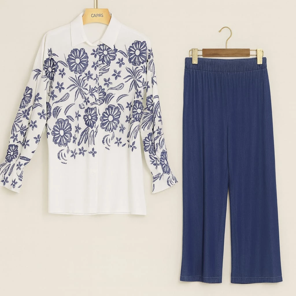 1. طقم فاخر مكوّن من قميص أبيض ناعم وسترة سماوية بتفاصيل ترتر لامعة، مع بنطال بنفس اللون بخامة خفيفة وانسيابية. يجمع التصميم بين الرقة والتميّز بفضل الألوان الهادئة والتفاصيل الدقيقة على الصدر والياقة. مناسب للمناسبات الخفيفة أو الاجتماعات العصرية، ويمنح إطلالة متكاملة بأناقة راقية.