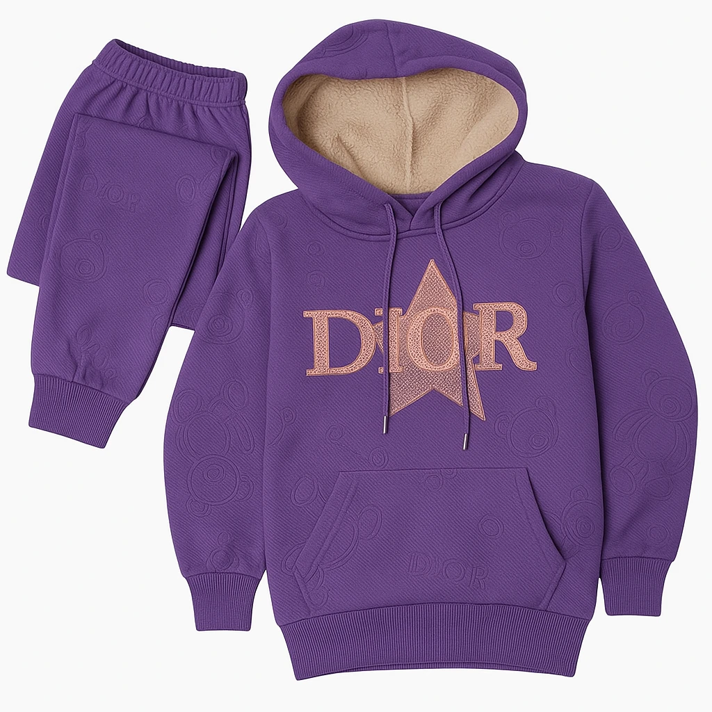 طقم شتوي فاخر بلون بنفسجي غني، مزين بتطريز لامع على الصدر بتصميم نجمة وشعار “DIOR”.