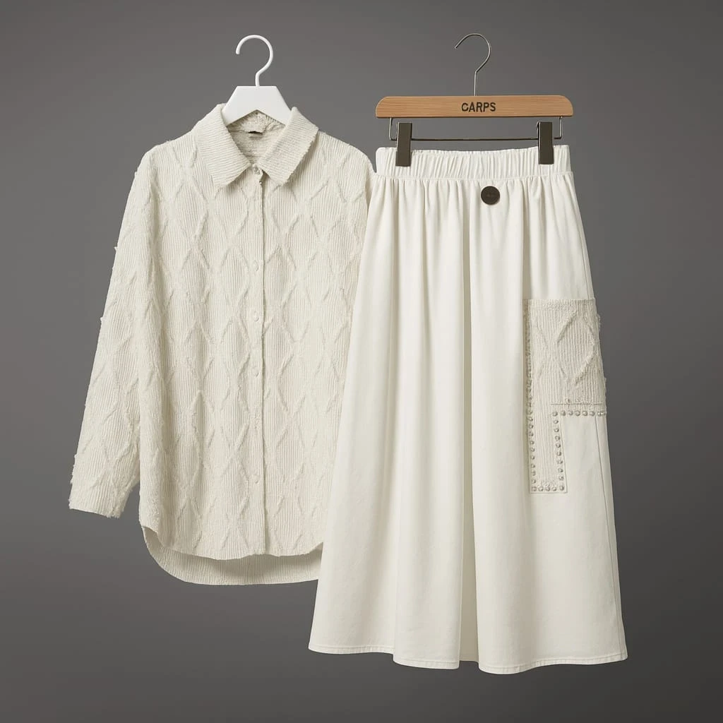 طقم فاخر باللون الكريمي يجمع بين قميص بتفاصيل نسيجية راقية وتنورة واسعة بجيب جانبي مزخرف يضيف لمسة أنوثة راقية. مصنوع من قماش قطني مريح وناعم على البشرة، يمنحك إطلالة متناسقة تجمع بين البساطة والفخامة. مثالي للمناسبات النهارية أو الإطلالات الهادئة بأناقة عصرية متكاملة.