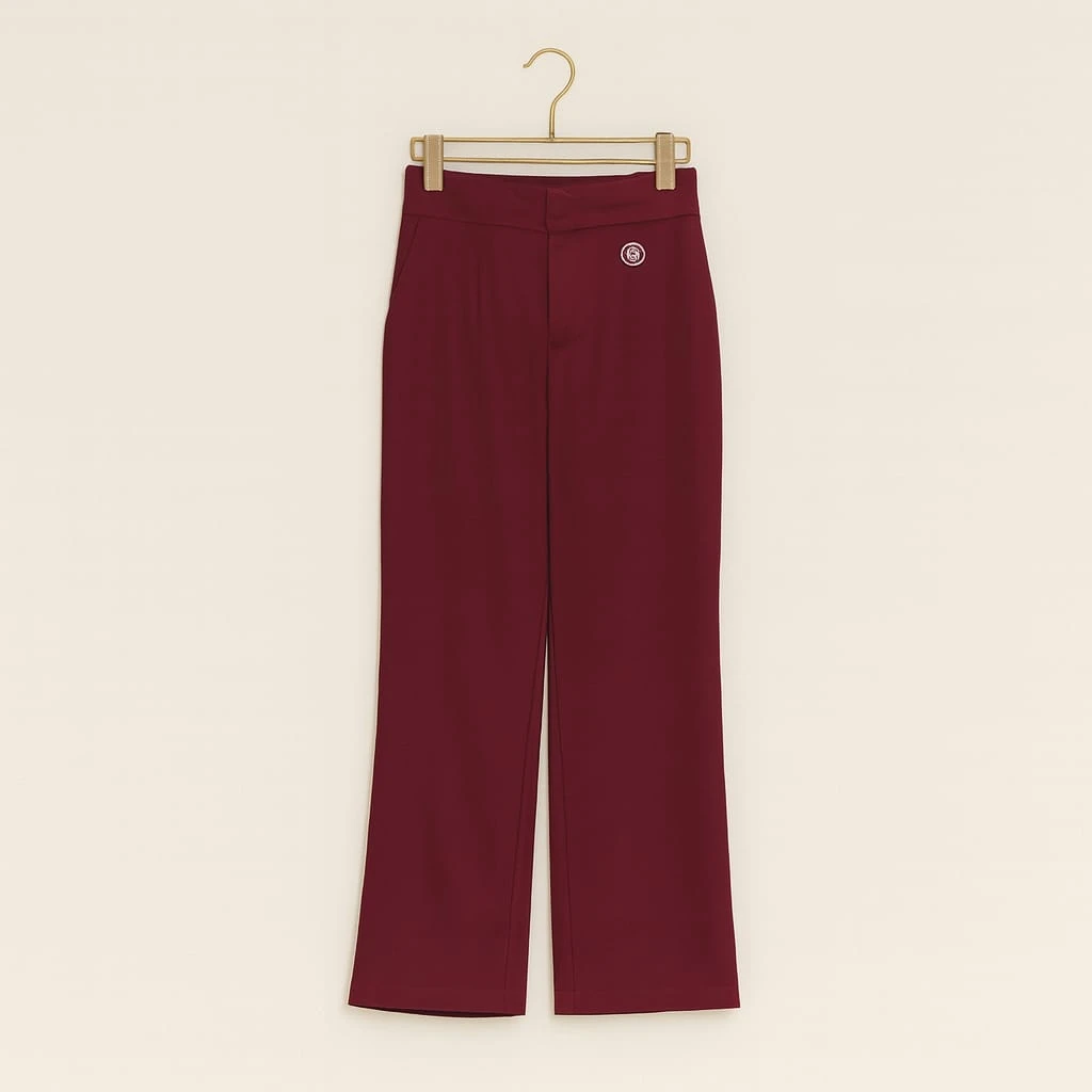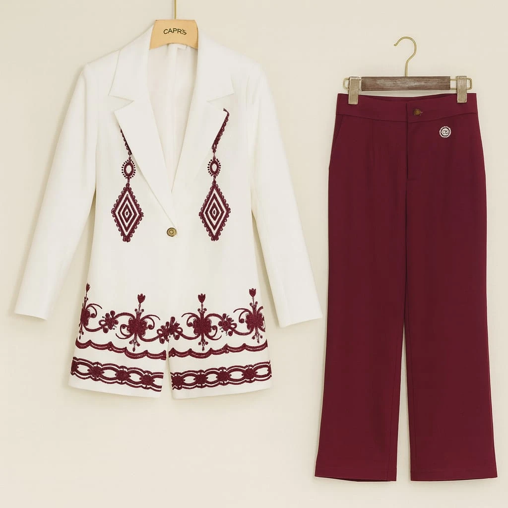 طقم فاخر يجمع بين بليزر أبيض مطرز بتفاصيل هندسية وعنابية أنيقة، وبنطال باللون العنابي الغني. يتميز بتصميم راقٍ يعكس فخامة الأزياء العصرية ويمنحك حضورًا أنثويًا مميزًا في المناسبات الرسمية والمساءات الراقية.