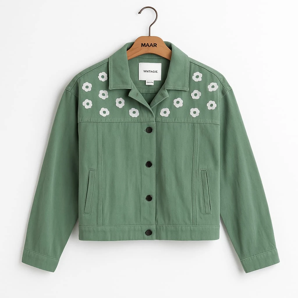 طقم نسائي باللون الأخضر الفاتح مطرز بزهور بيضاء صغيرة، مصنوع من خامة مريحة تناسب الإطلالات اليومية الكاجوال.
