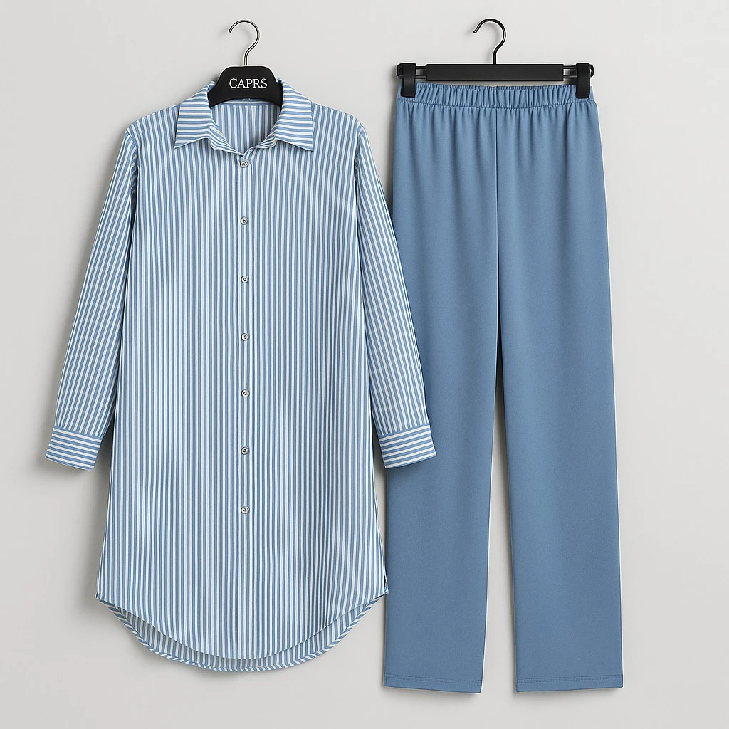 طقم نسائي أنيق بلون أزرق سماوي بتصميم ناعم يجمع بين البساطة والراحة. يتكون من قميص طويل بخطوط بيضاء عمودية تمنح مظهراً عصرياً جذاباً، مزود بأزرار أمامية وياقة كلاسيكية تضيف لمسة من الأناقة، مع بنطال بنفس اللون بخصر مطاطي لراحة مثالية طوال اليوم. خامة ناعمة وخفيفة تناسب الإطلالات اليومية أو العمل بأسلوب أنثوي مريح وأنيق.