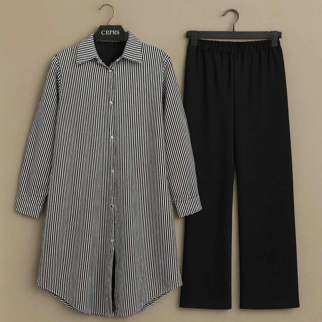 طقم نسائي أنيق بتصميم عملي يجمع بين القميص المخطط والبنطال الأسود الكلاسيكي. يتميز القميص بخطوط طولية تضفي مظهراً عصرياً وانسيابياً، مع أزرار أمامية وياقة رسمية تضيف لمسة من الأناقة البسيطة. البنطال مصنوع بقصّة مستقيمة وخصر مطاطي لراحة أكبر أثناء الارتداء. خامة ناعمة وخفيفة مناسبة للإطلالات اليومية أو المكتب بأسلوب أنثوي متوازن بين الراحة والأناقة.