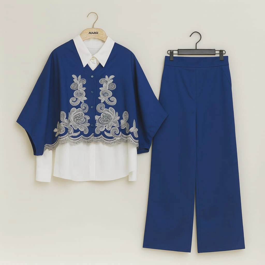 تألّقي بإطلالة راقية تجمع بين الفخامة والأنوثة مع هذا الطقم الأنيق باللون الأزرق الملكي. يتميّز القميص بتصميم واسع وتطريز زهري جذّاب باللون الفضي يمنح لمسة فنية مميزة، مع ياقة بيضاء أنيقة تضيف توازنًا كلاسيكيًا. يأتي الطقم مع بنطال أزرق مستقيم يمنحك مظهرًا متناسقًا ومريحًا في الوقت نفسه. مناسب للمناسبات الخاصة والإطلالات الراقية اليومية.