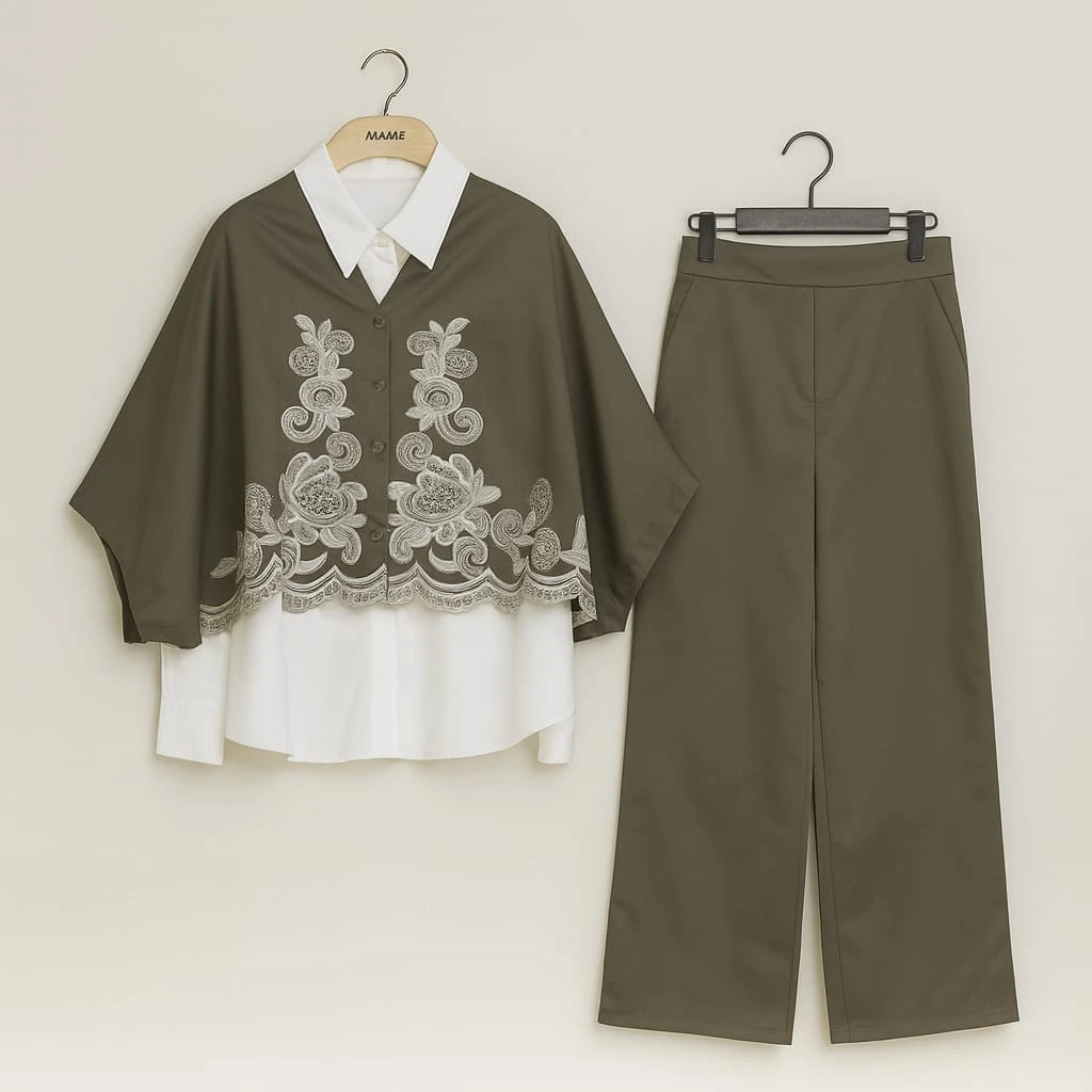 اختاري الأناقة الهادئة مع هذا الطقم النسائي المميز بلونه الزيتي العصري وتفاصيله الراقية. يتكوّن من قميص واسع مطرّز بنقوش زهريّة أنيقة بلون بيج فاتح مع ياقة بيضاء تمنحه لمسة فخامة، ويأتي معه بنطال زيتي بقصّة مستقيمة تعزز المظهر المتناسق والأنيق. تصميم عملي يناسب الإطلالات اليومية والمناسبات الخاصة على حدٍ سواء.