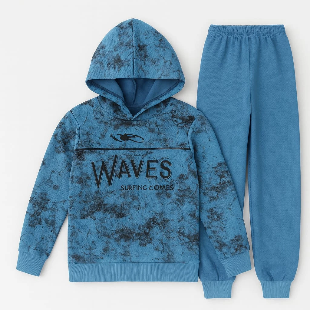 طقم ولادي أنيق بلون أزرق متوسط، مصنوع من خامة دافئة ومريحة. تصميم مطبوع برسمة WAVES المستوحاة من أجواء البحر والمغامرة. مثالي للإطلالات اليومية.