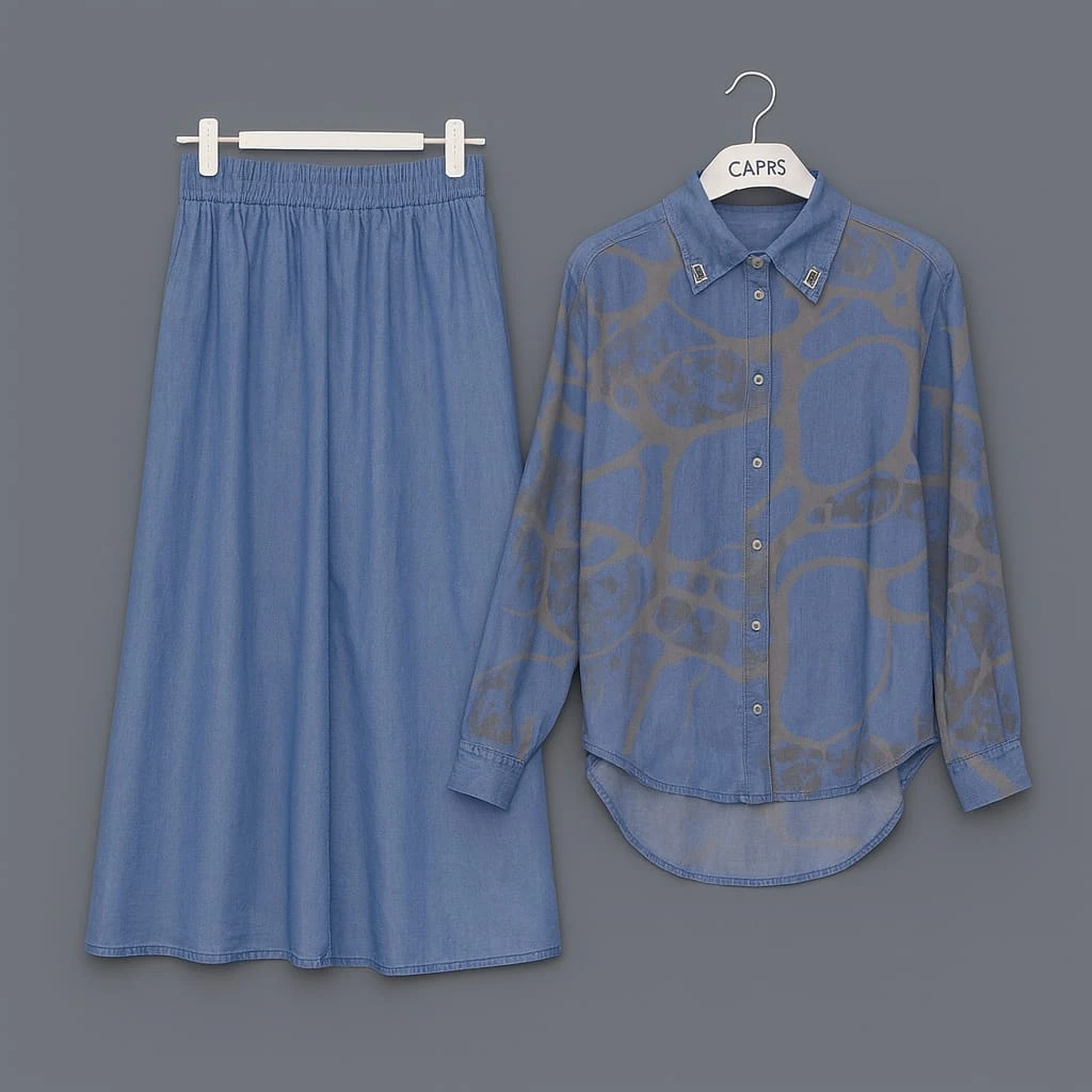 طقم راقٍ من قماش الدنيم الفاخر باللون السماوي الفاتح، يتكوّن من قميص طويل الأكمام بنقوش ناعمة تضيف لمسة عصرية، وتنورة واسعة بخصر مطاطي مريح. تصميم عملي وأنيق يناسب الإطلالات اليومية والمناسبات البسيطة، يتميز بخفة القماش وجودة الخياطة ليمنحك راحة وأناقة في آنٍ واحد.