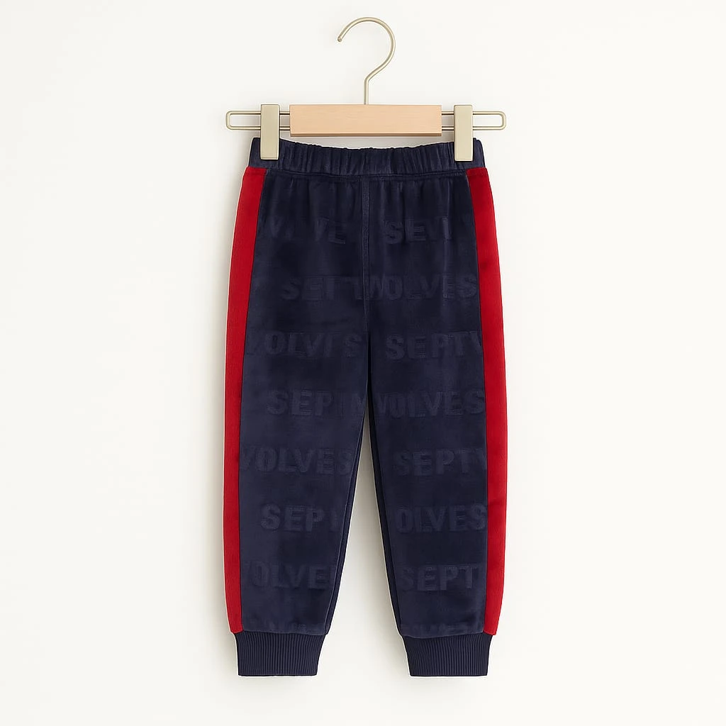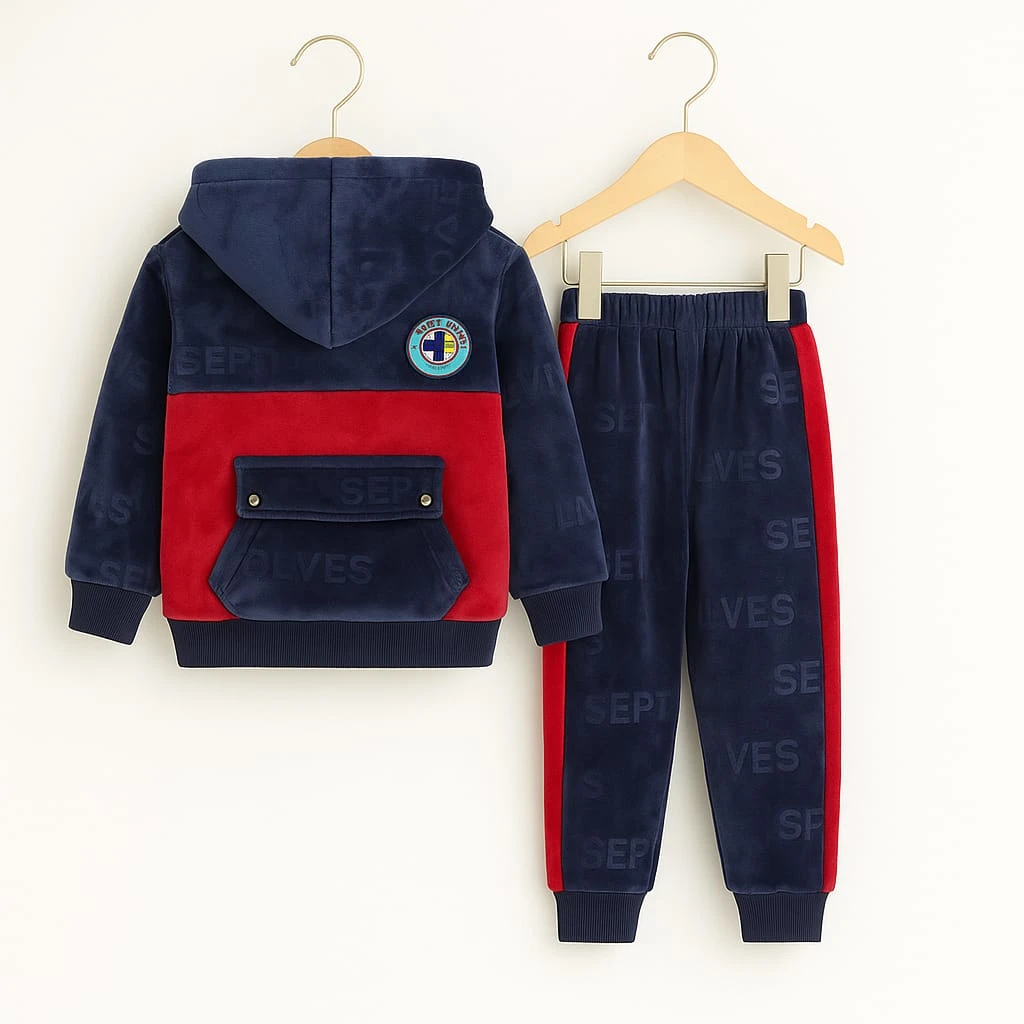 يتكون من جاكيت بقبعة وسروال بنفس اللون، يجمع بين اللون الكحلي العميق والأحمر الحيوي مع تطريز جانبي أنيق وشعار صغير يمنحه مظهرًا رياضيًا عصريًا.