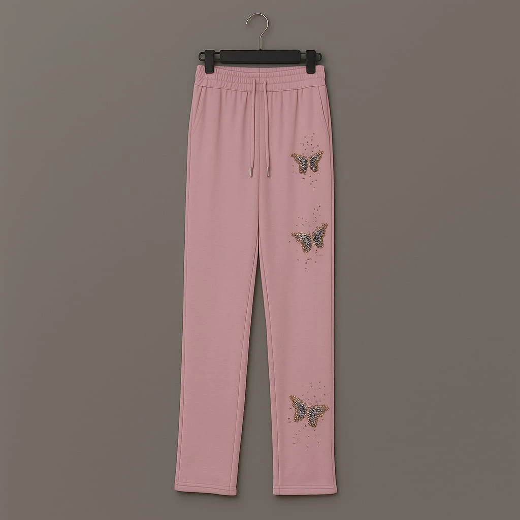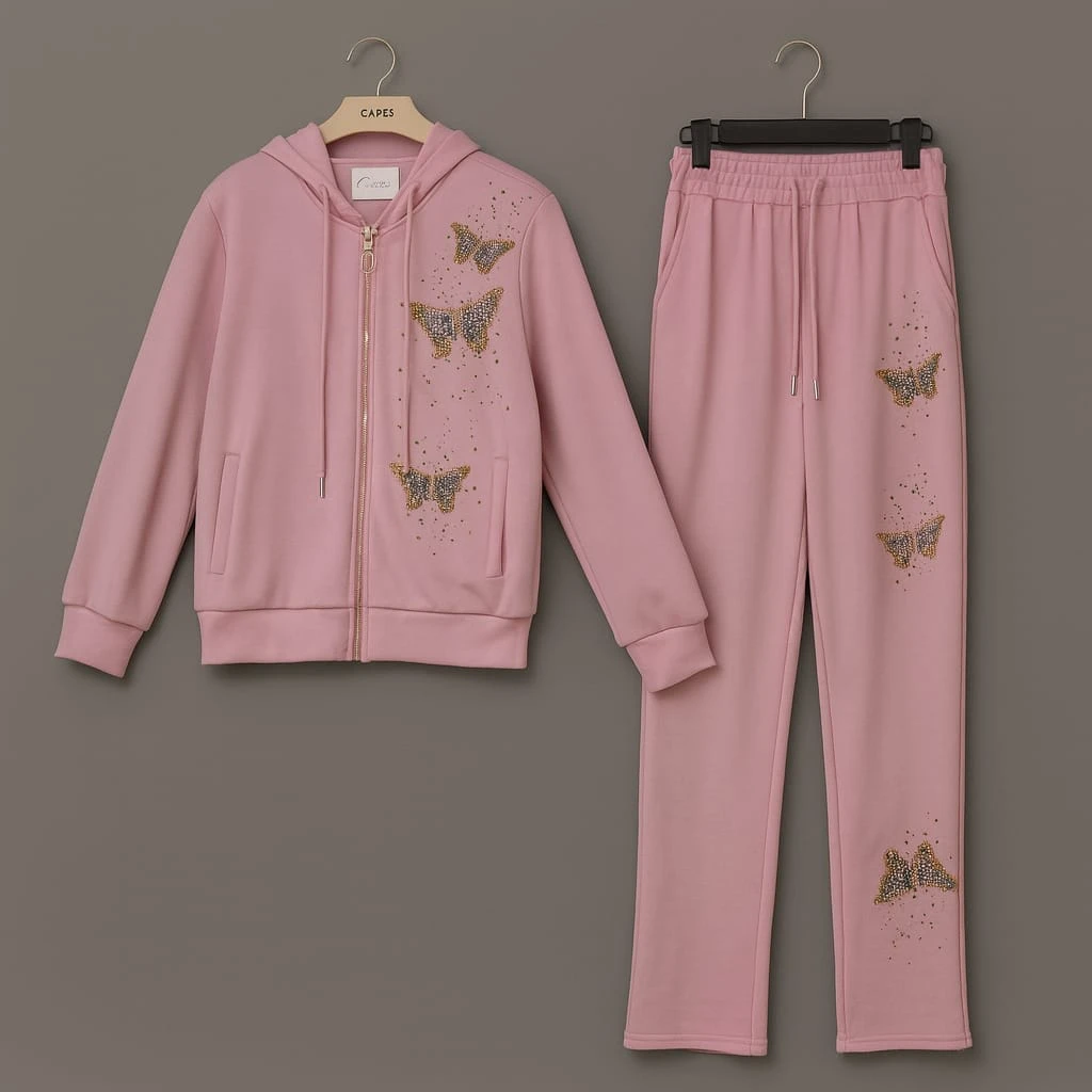 ترينغ ناعم بلون زهري مطرز بفراشات لامعة تضيف لمسة مرحة وأنيقة. يتميز بقماش مريح وناعم مع سحاب أمامي وجيبين جانبيين، مثالي للإطلالات اليومية أو المشاوير الكاجوال الأنيقة.