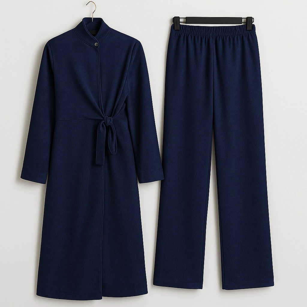 طقم شرعي نسائي أنيق بلون كحلي داكن، يتميز بتصميم محتشم يجمع بين البساطة والرقي. يتكون من معطف طويل بأكمام مستقيمة وربطة جانبية تضيف لمسة أنثوية ناعمة، مع بنطال واسع بخصر مطاطي يمنح راحة وسهولة في الحركة. مصنوع من قماش ناعم متوسط السماكة يمنح دفئاً وخفة في الوقت نفسه، مناسب للاطلالة اليومية أو المناسبات الهادئة بأسلوب شرعي أنيق ومحتشم.