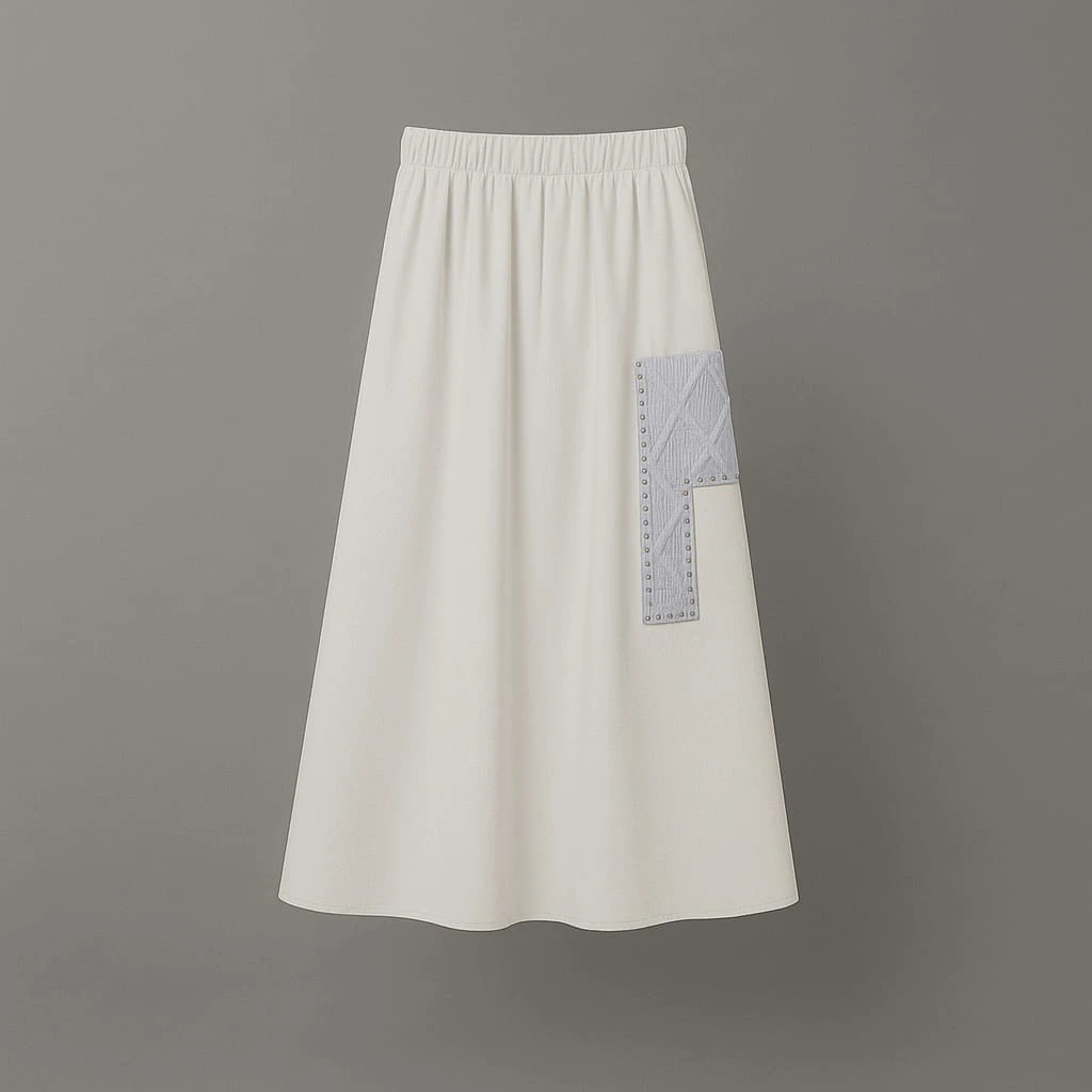 طقم أنثوي أنيق من قطعتين يتكوّن من قميص أزرق مزخرف بخطوط بارزة بتصميم راقٍ، وتنورة أوف وايت طويلة بجيب جانبي من نفس قماش القميص لإطلالة متناسقة.قماشة ثقيلة . بقطن 55%